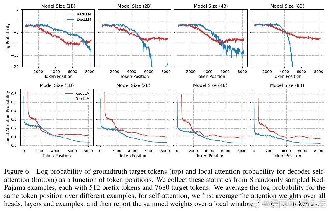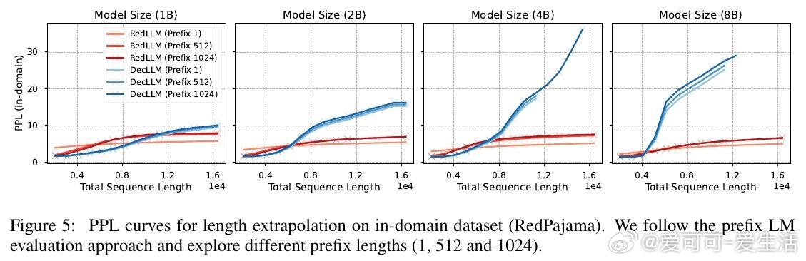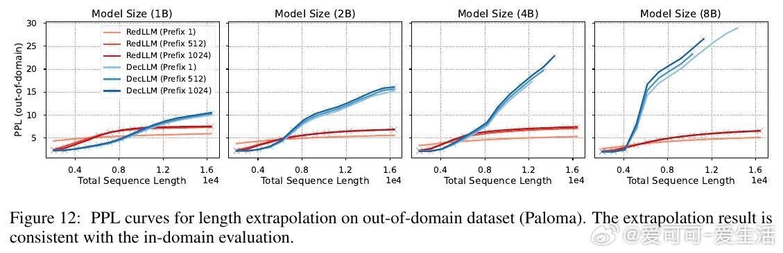 2. RedLLM在上下文长度外推(context length extrapolation)能力上表现突出,甚至优于DecLLM,展现对长文本处理的潜力。