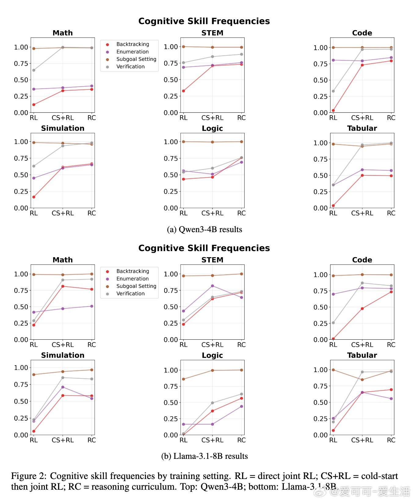 在两个代表性模型Qwen3-4B和Llama-3.1-8B上的实验证明,该课程训练方法能显著超越同规模基线,甚至在部分任务上媲美或优于32B级别的大模型。针对Llama模型,作者进一步引入了数学训练阶段的难度递进策略(中等难度先于高难度),稳定了训练过程并提升性能。消融实验表明,冷启动和数学强化学习两个阶段缺一不可,均对最终性能贡献显著。认知技能分析显示,数学优先的训练有效提升了验证和回溯等高级认知行为的使用频率,这些技能对于解决复杂问题至关重要。