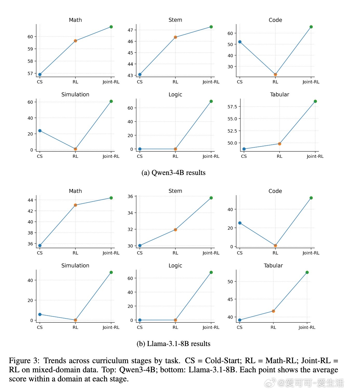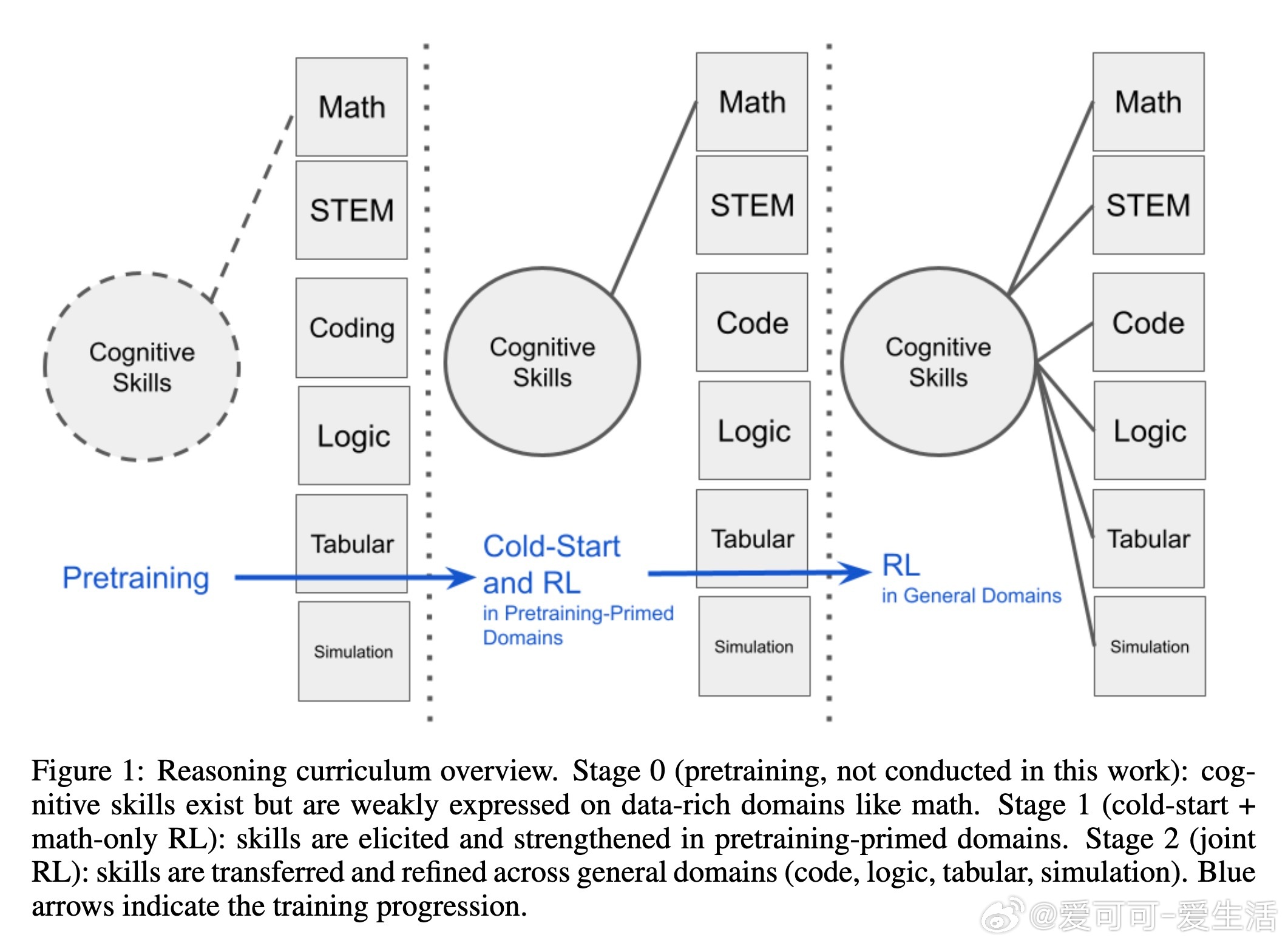 本文介绍了“推理课程”(Reasoning Curriculum),一种简单且高效的两阶段训练策略,旨在提升大语言模型(LLMs)的广泛推理能力。核心思路是:先在数学这一预训练中模型较为擅长且奖励易验证的领域,通过冷启动和强化学习(RL)阶段强化推理技能;随后在多领域混合数据上进行联合强化学习,迁移并巩固这些技能,实现跨领域推理能力的提升。