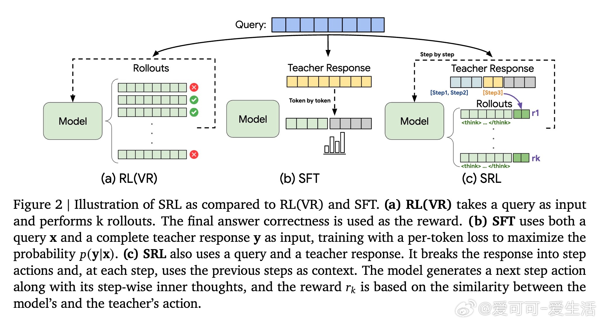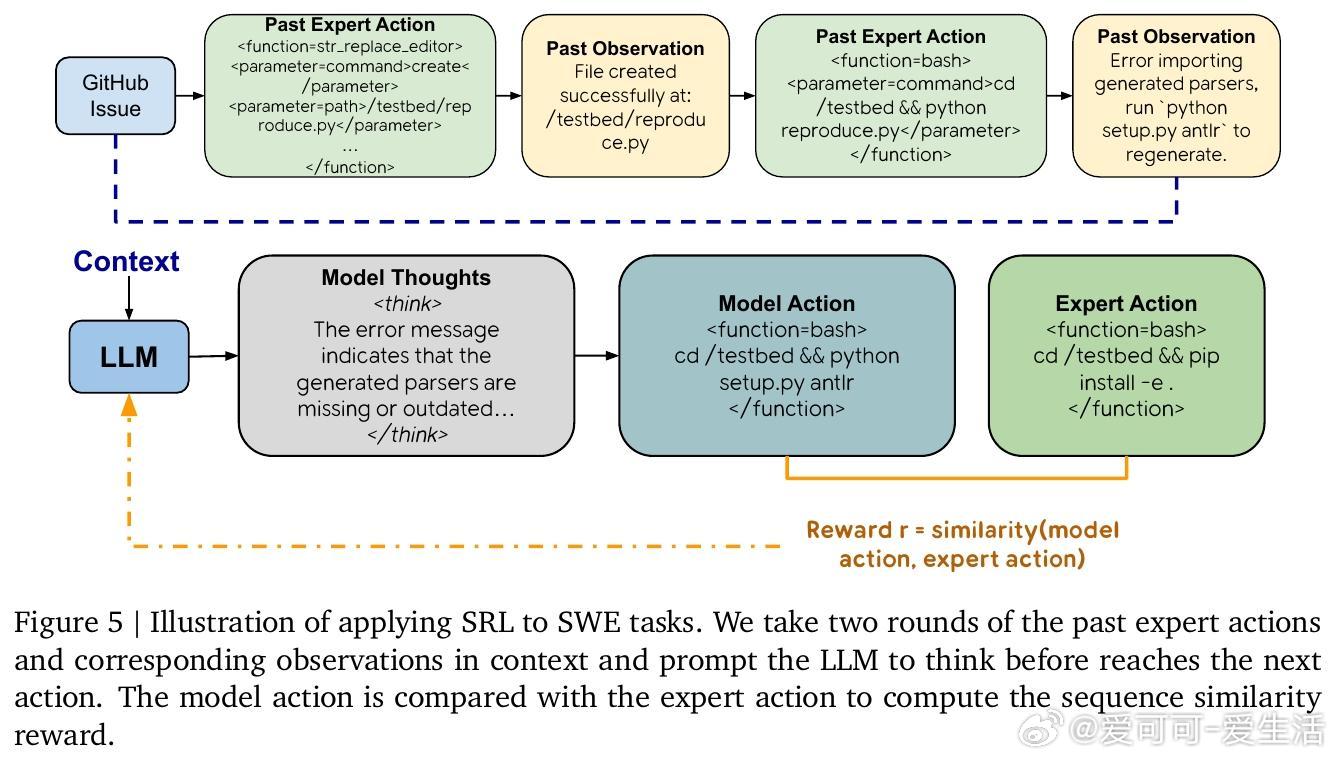 传统强化学习(RL)依赖最终答案对模型奖励,难以在复杂推理中找到正确路径,导致训练失败;监督微调(SFT)则因逐字模仿易过拟合,缺乏灵活性。SRL创新性地将问题拆解为一系列“步骤动作”,并要求模型在每一步先生成内部推理“思考独白”,再输出动作。每步动作与专家轨迹对比,给予细粒度相似度奖励,提供丰富、平滑的训练信号。