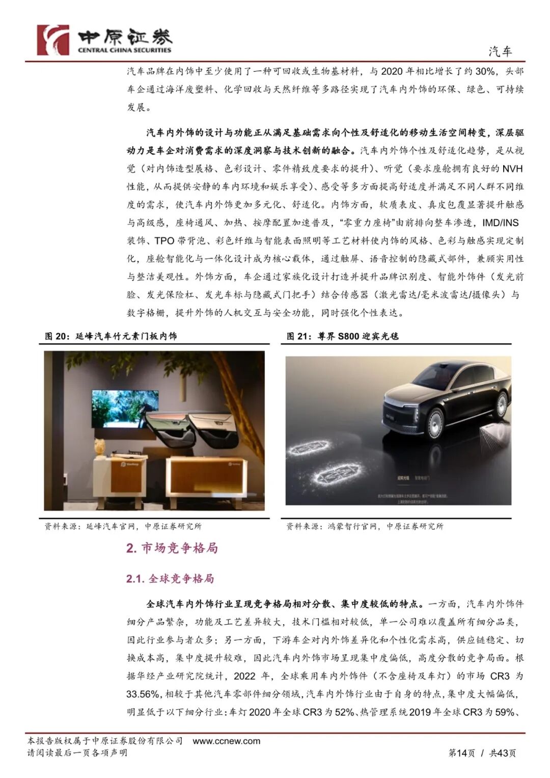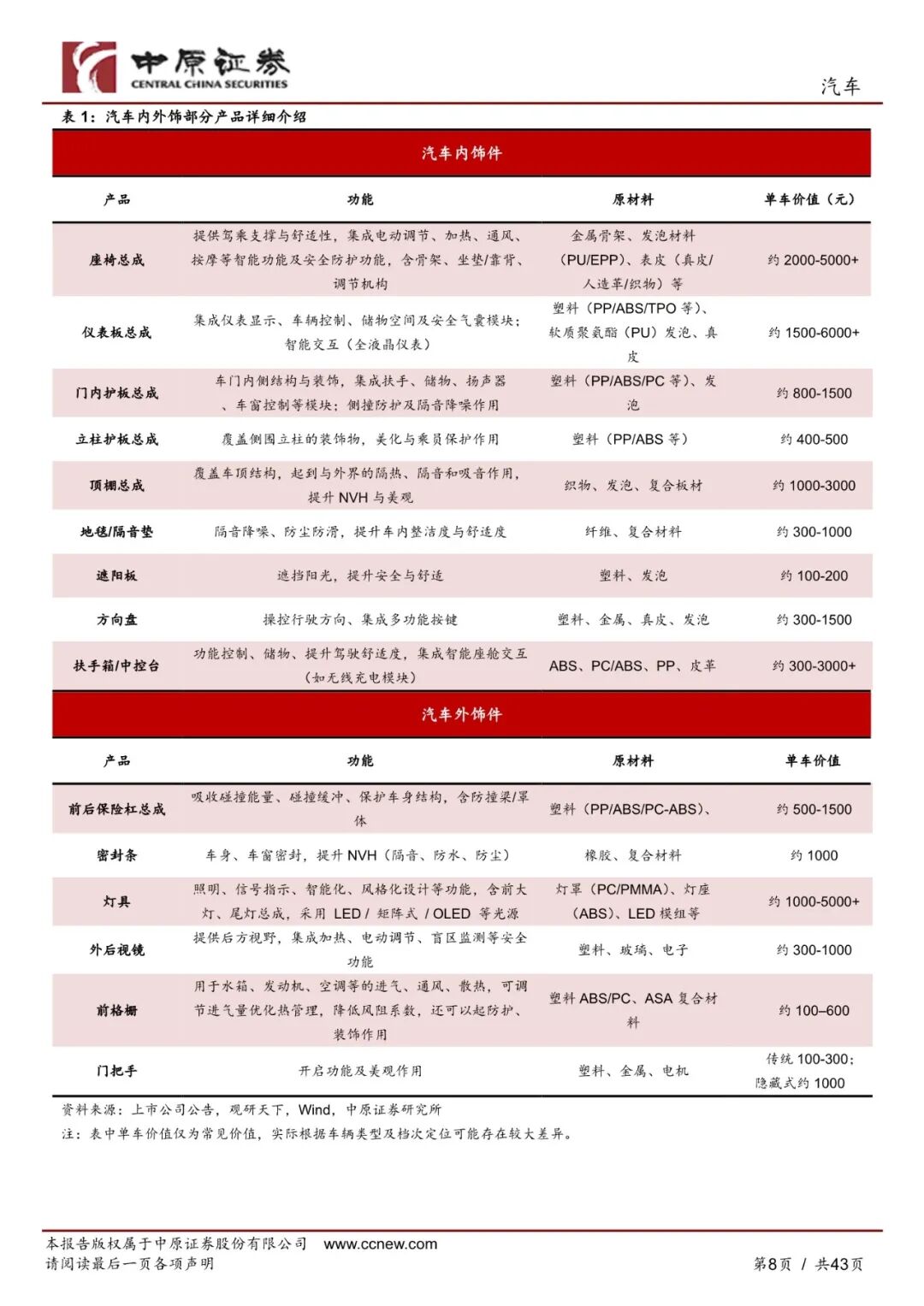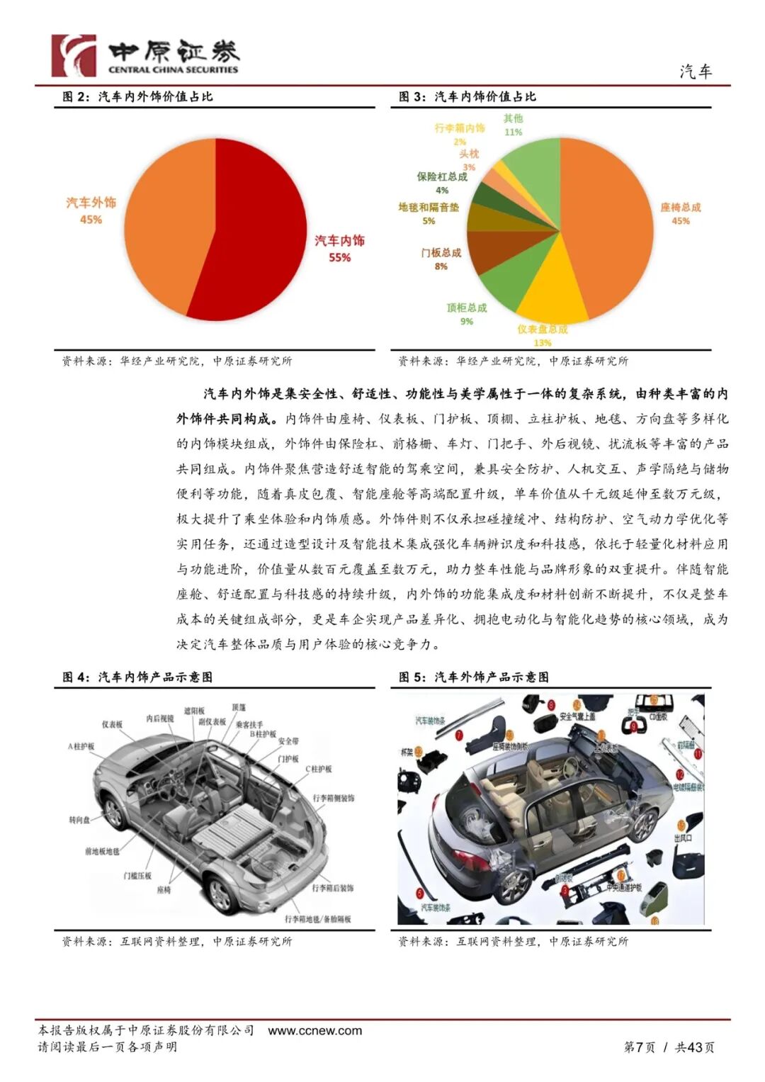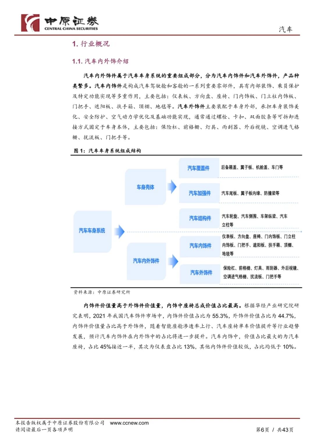 汽车内饰件是构成汽车驾驶舱和客舱的一系列重要零部件,主要包括:仪表板、方向盘、座椅、门内饰板、门立柱内饰板、门把手、遮阳板、扶手箱、顶棚、地毯等。汽车外饰件装配于车身外部,主要包括:保险杠、前格栅、灯具、雨刮器、外后视镜、空调进气格栅、扰流板、门把手等。