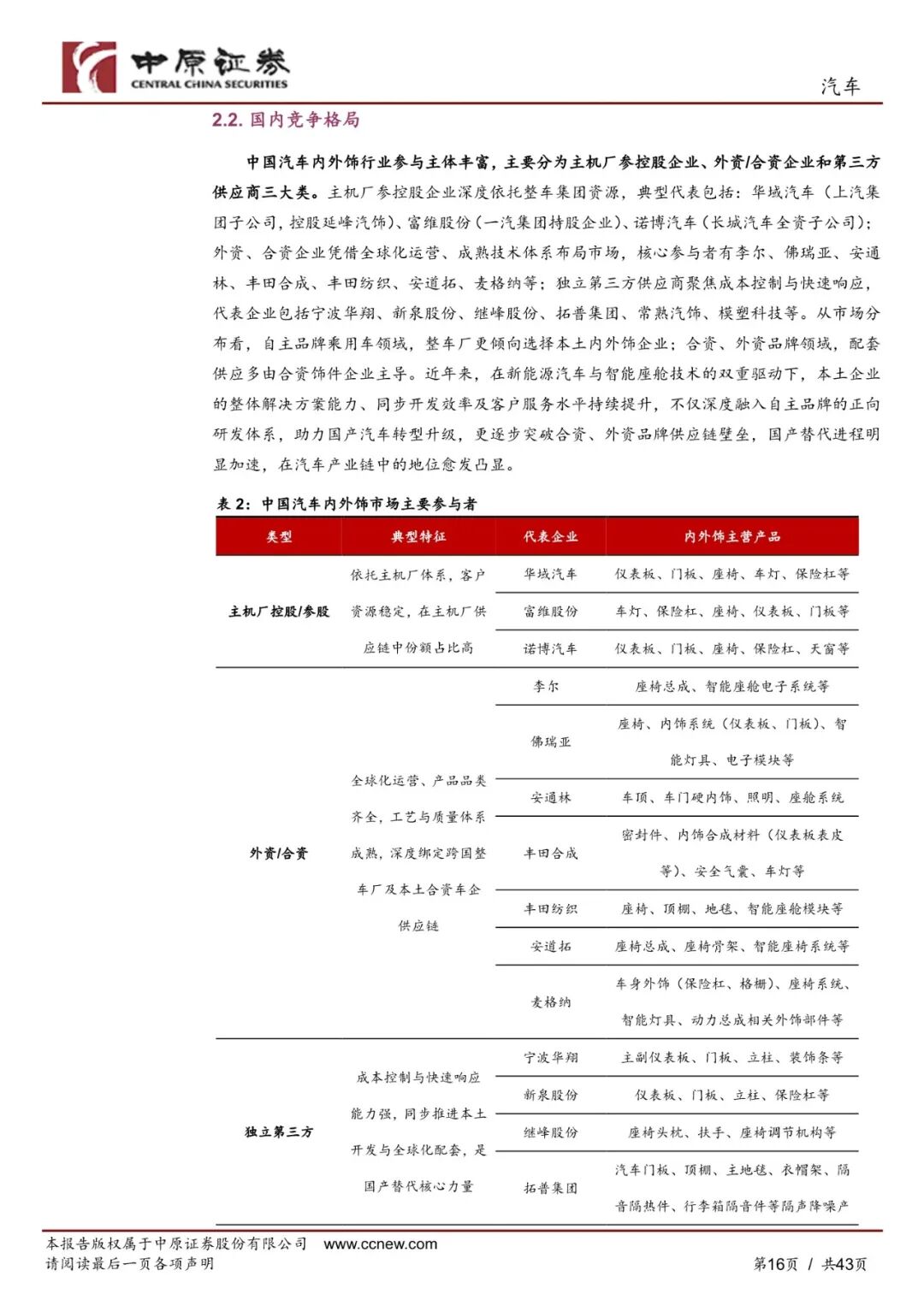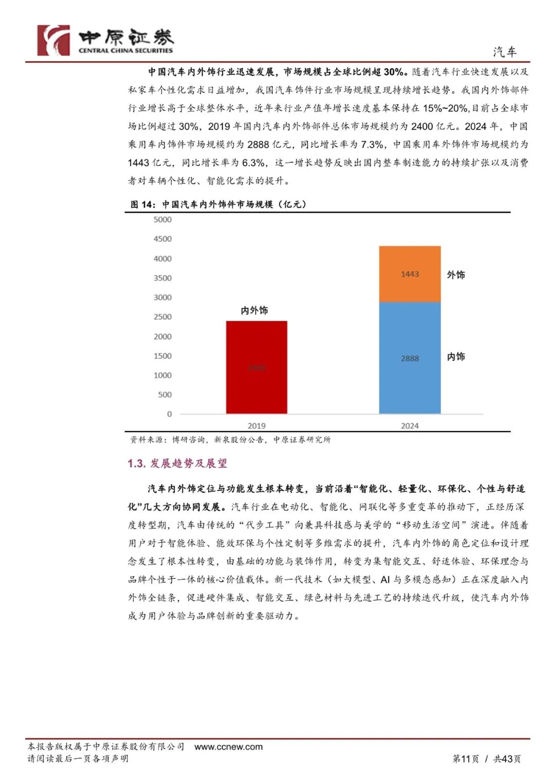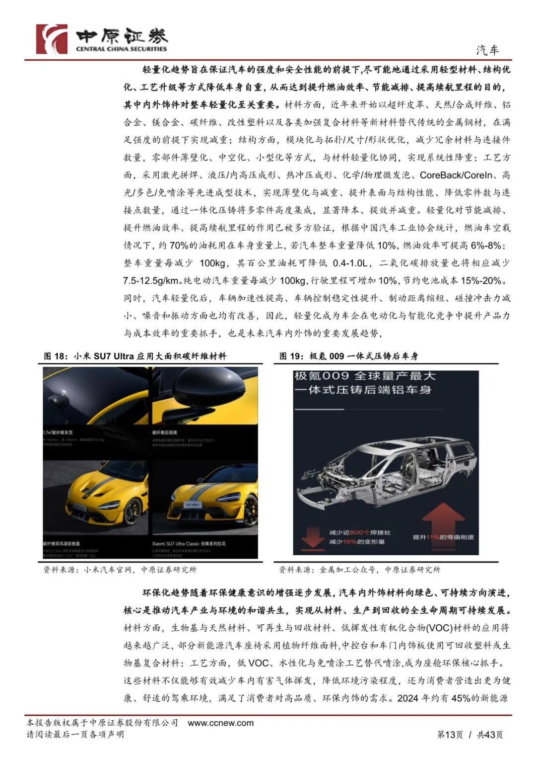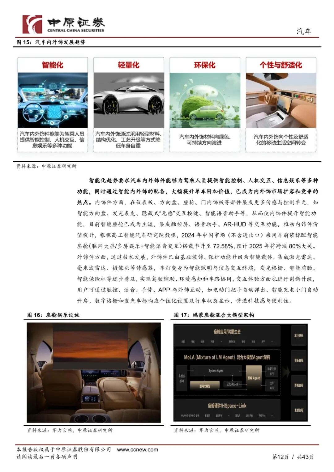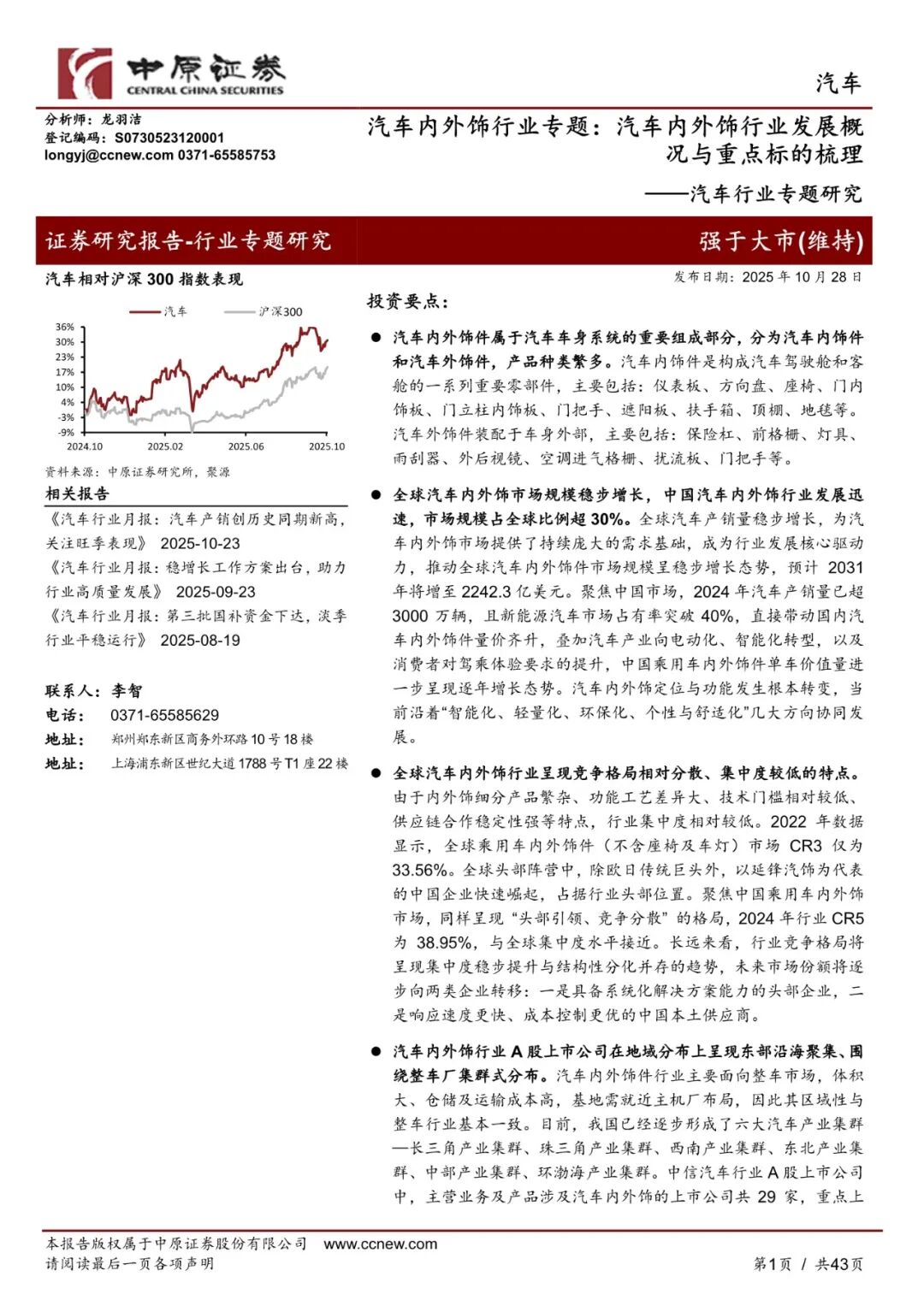 汽车内饰件是构成汽车驾驶舱和客舱的一系列重要零部件,主要包括:仪表板、方向盘、座椅、门内饰板、门立柱内饰板、门把手、遮阳板、扶手箱、顶棚、地毯等。汽车外饰件装配于车身外部,主要包括:保险杠、前格栅、灯具、雨刮器、外后视镜、空调进气格栅、扰流板、门把手等。