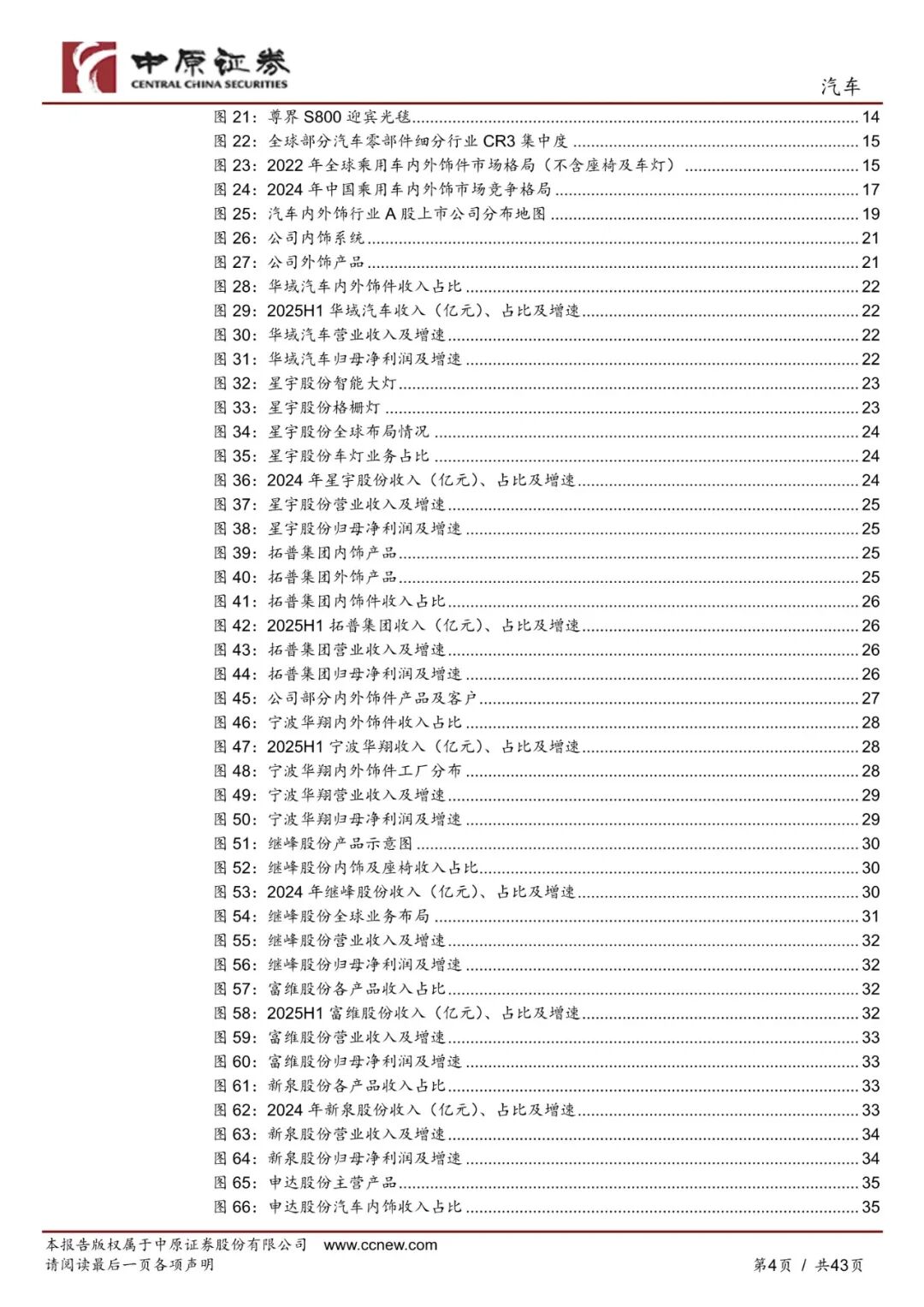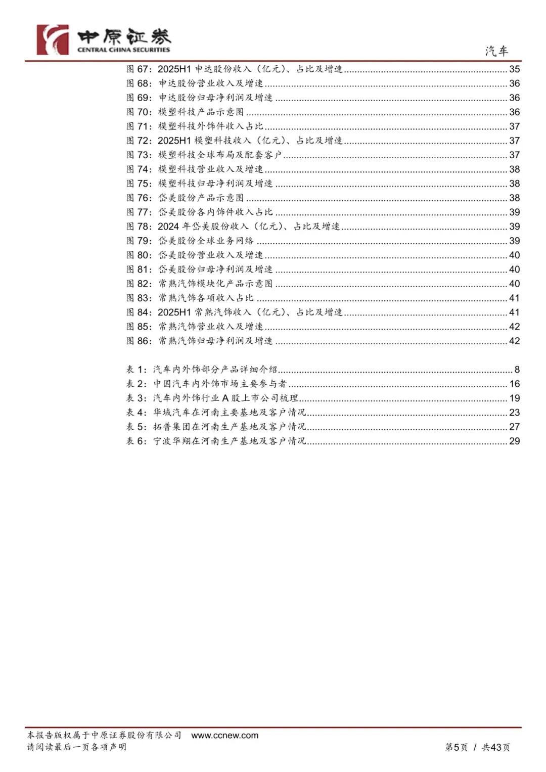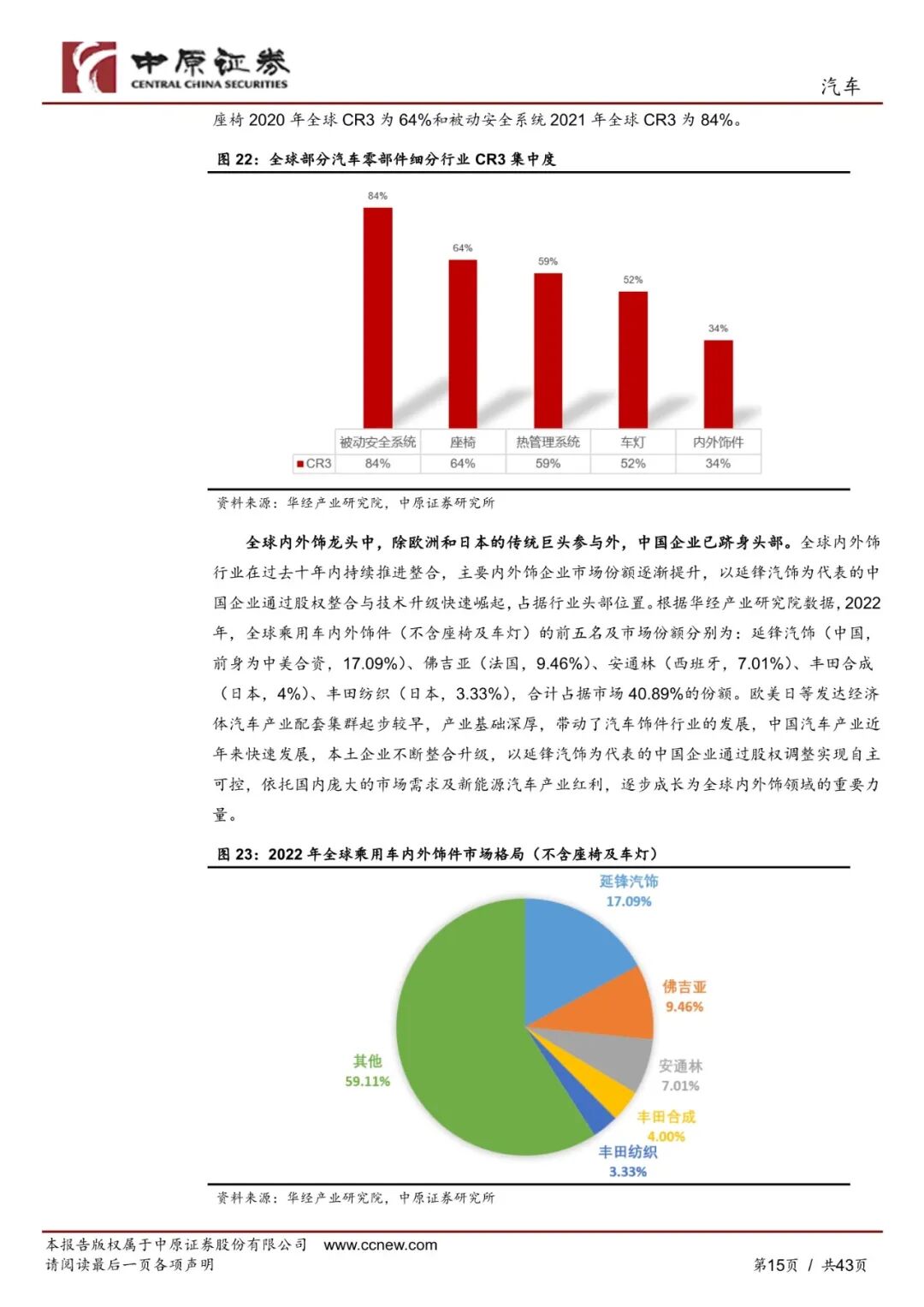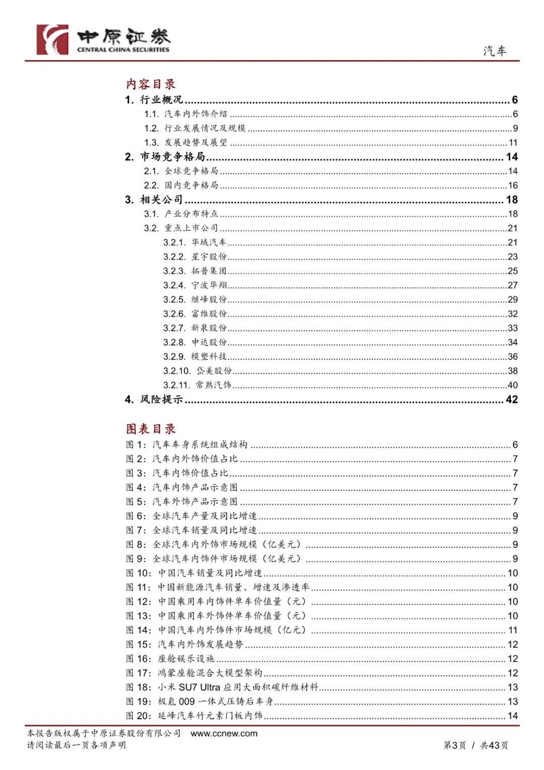 汽车内饰件是构成汽车驾驶舱和客舱的一系列重要零部件,主要包括:仪表板、方向盘、座椅、门内饰板、门立柱内饰板、门把手、遮阳板、扶手箱、顶棚、地毯等。汽车外饰件装配于车身外部,主要包括:保险杠、前格栅、灯具、雨刮器、外后视镜、空调进气格栅、扰流板、门把手等。