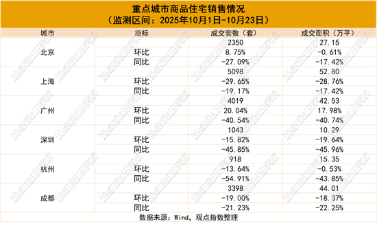 其中,商品住宅成交面积192.12万平方米,环比下降12.53%,商品住宅成交套数1.68万套,环比下降12.61%,显示前期政策宽松带来的需求释放已近尾声。截至2025年10月前三周,商品住宅成交面积3152.14万平方米,同比下降9.22%。此外,叠加去年同期9.24新政带来的高基数影响,同比下降较多。