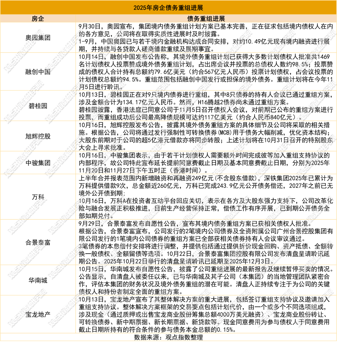 此外,房企债务重组已从“单一债务展期”向“股债结合+经营恢复”的综合方案演进,核心目标是通过债务结构优化与现金流改善,推动企业回归良性经营轨道。其他如奥园、旭辉、中骏等企业亦在推进境内债务展期、境外重组支持协议签署等进程,行业整体呈现“分化重组、稳中求进”的态势。