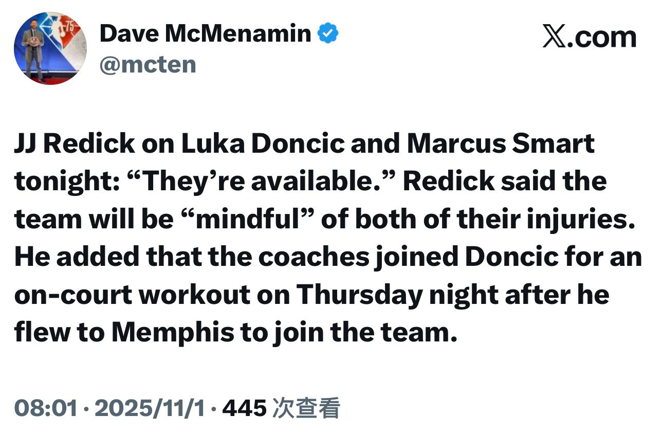 雷迪克表示,球队会“留意”两人的伤势。教练们在东契奇周四晚上飞到孟菲斯与球队会合后,与他一起进行了场上训练。 ​​​