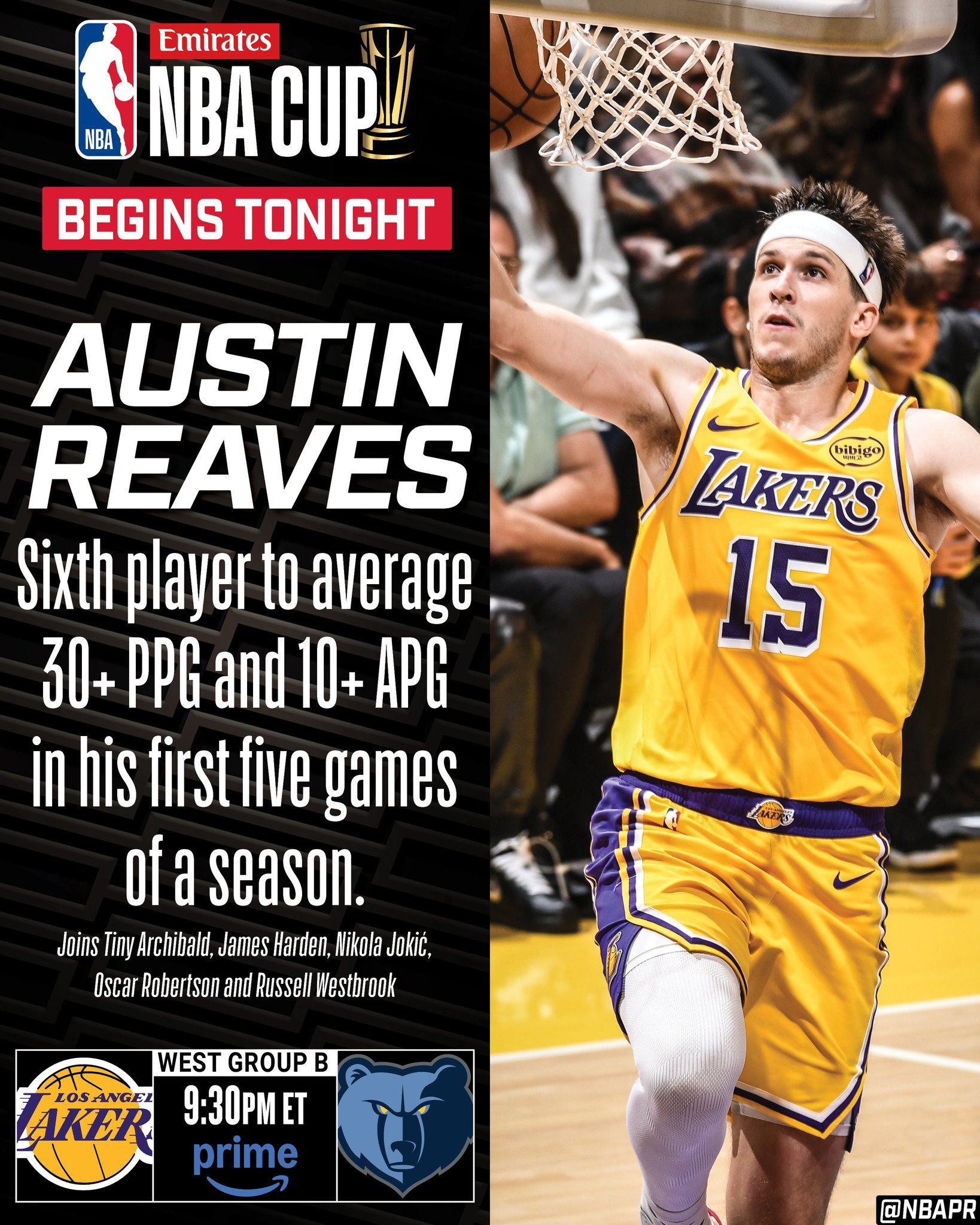 奥斯汀·里夫斯是历史上第六位在赛季前五场比赛中场均得分30+和助攻10+的球员,前五位分别是: