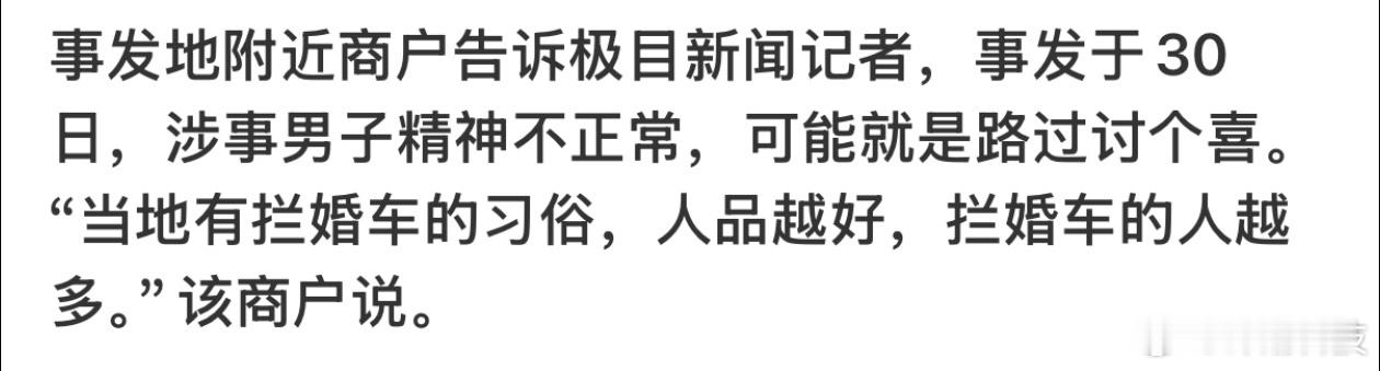 “当地有拦婚车的习俗,人品越好,拦婚车的人越多”