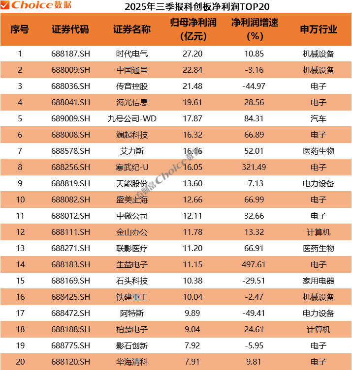 科创板“盈利王”是时代电气,净利润达到27.2亿元,中国通号、传音控股位居第二、第三。(中芯国际暂未披露)