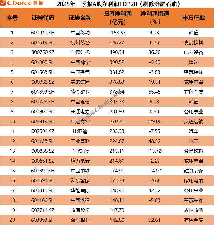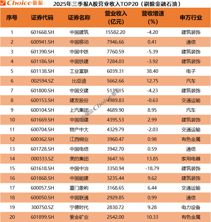 剔除金融、石油,中国建筑、中国移动、中国中铁、中国铁建、工业富联排名2025年三季报营收榜前五。