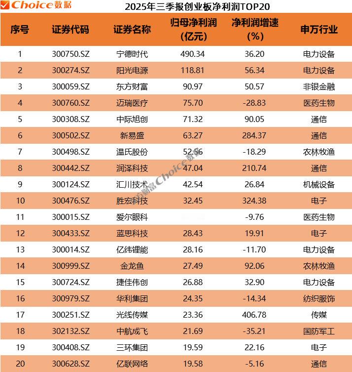 创业板方面,宁德时代以490.34亿元的净利润位居创业板2025年三季报“盈利王”,阳光电源、东方财富位居第二、第三