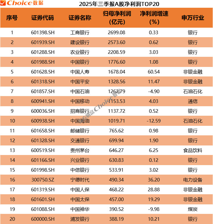 归母净利润方面,工商银行以2699.08亿元位居A股2025年三季报利润榜首位;建设银行、农业银行、中国银行分别以2573.6亿元、2208.59亿元、1776.6亿元排名第二、第三、第四。