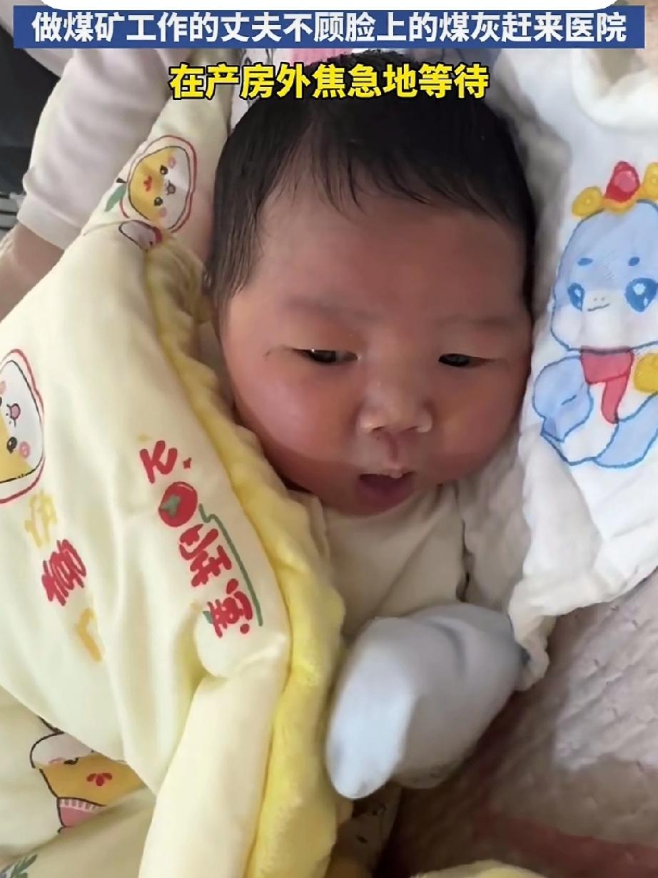 做煤矿工作的丈夫顾不得洗掉满脸的灰碳,得知妻子进了产房慌忙赶到医院,在产房外焦急地等待,时不时望向里面,一定是担心妻子的安危,盼望着母子快点平安出产房,也许出于丈夫的工作无法脱身,不能陪妻子提前来医院生孩子,妻子的理解包容让丈夫很宽心,看到母子平安出来丈夫总算松了一口气!