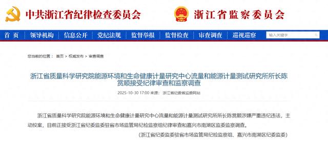 据浙江省纪委监委网站10月30日消息:浙江省质量科学研究院能源环境和生命健康计量研究中心流量和能源计量测试研究所所长陈赏顺涉嫌严重违纪违法,主动投案,目前正接受浙江省纪委监委驻省市场监管局纪检监察组纪律审查和嘉兴市南湖区监委监察调查。