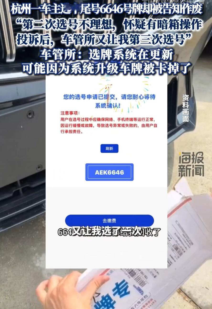 “这么巧合吗?”浙江杭州,男子买了新车后到车管所选号,在一众随机数字中,第一眼就相中了尾号“6646”的车牌,可当他提交缴费时,却被告知号码作废,需要重新选号,可看看下一组的号码,他怀疑这里面可能存在暗箱操作 史先生介绍,当时高高兴兴去车管所选车牌。屏幕上跳出一组随机号码,他一眼就相中尾号6646的牌子,顺口好记,看着也舒服。他没多犹豫,直接点了确认 但系统提醒后,史先生一时没反应过来,去找工作人员询问,对方只简单解释:这个号不能用了,你再选一次吧 他只好回到选号机前,可下一批号码里,再也找不到像6646那样顺眼的组合。要么数字不连贯,要么没什么规律,总之不合眼缘,想了一夜,他总觉得这个事不对劲,后来找到车管所,对方又给了他一次选号的机会 车管所后来回应说,可能是系统升级导致车牌被卡住,属于技术问题。他们表示会进一步优化系统,避免类似情况发生 说实话,这种事也确实可能发生。全国范围内车管系统升级、数据对接、号段同步,都可能短暂出现号码卡死、锁号、延迟释放等情况。但问题在于,群众不是搞系统的,他们看到的只是“我选中了,你又不给我”,这可能心里就不舒服了 我觉得,这事的关键不是号码本身,而是车主能不能相信整个流程是干净的。选号系统既然是随机的,就应该让人感觉公平 技术出问题可以理解,但遇到这种情况,车管所其实完全可以给出更清晰的操作记录,比如号码作废的时间点、原因代码、后台截图,哪怕只是形式上的透明,也能让人心里踏实