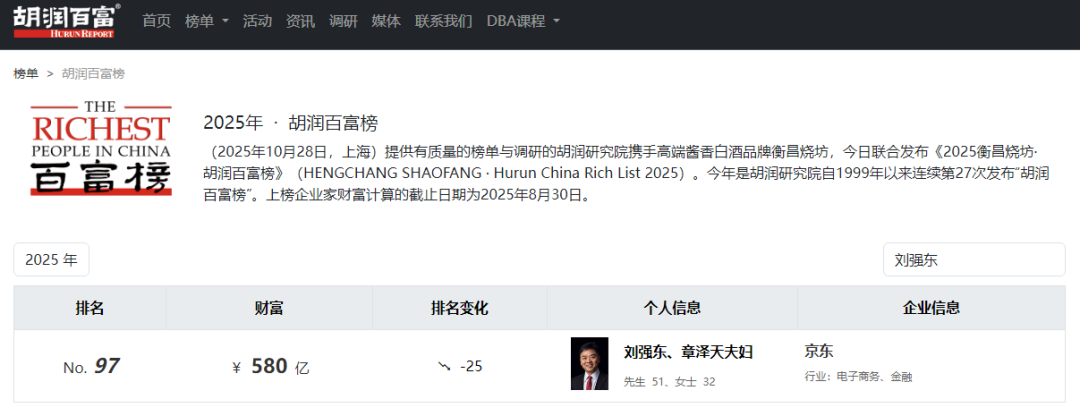 据胡润百富最新发布的富豪榜,刘强东、章泽天夫妇以580亿元的身家排名97。