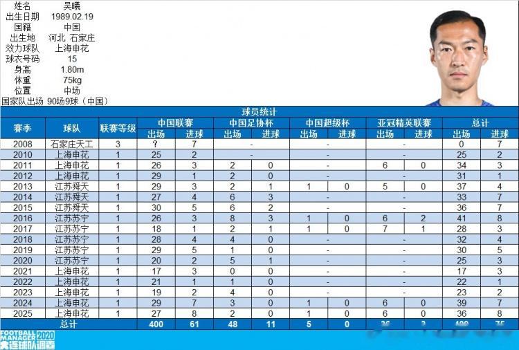 直播吧11月1日讯据博主“FM大连球队调查员”统计,吴曦已经达成了中国顶级联赛出场400场里程碑。
