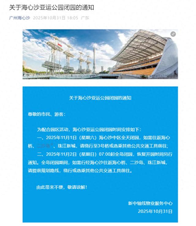 10月31日晚,广州海心沙发布关于海心沙亚运公园闭园的通知:为配合园区活动,11月1日(星期六)海心沙中区全天闭园,11月2日(星期日)07:00起全岛闭园,恢复开园时间另行通知。