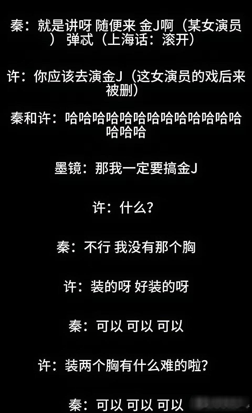 王家卫没有对金靖开黄腔,那段音频我认真听完了,如果没理解错,就是这个许编剧说秦雯编剧可以去演金靖这个角色,然后老王就说你演的话我肯定要搞你;然后小秦说自己胸没金那么大,许说胸可以装的;后面老王就说你要是胸有这么大就当不上编剧,我早把你收了。