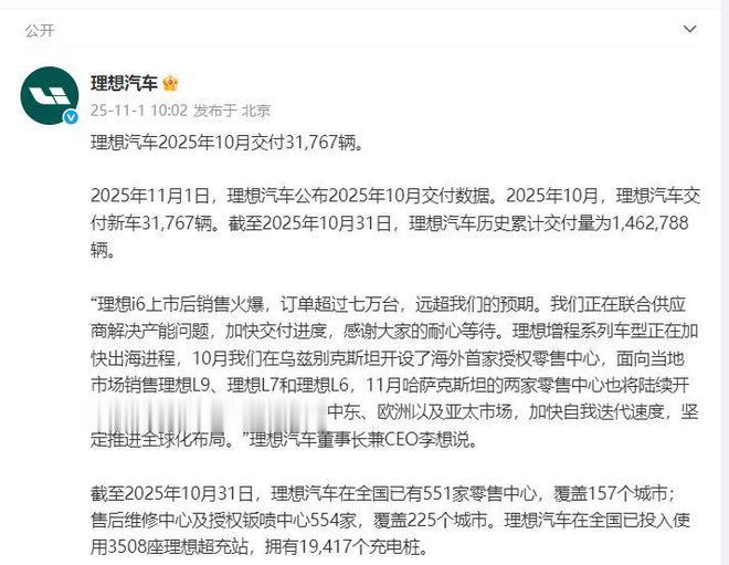 理想汽车在官微宣布,2025年10月交付了31767辆汽车。截至2025年10月31日,理想汽车历史累计交付量为1462788辆。