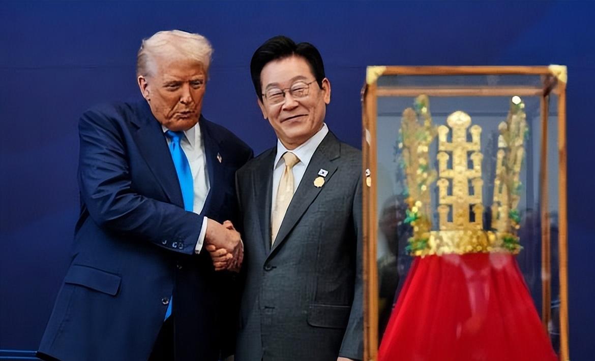 韩国人把特朗普坑惨了。现在美国人制作了特朗普戴上韩国王冠的样子。特朗普戴上韩国王冠的形象,成为了美国网络的新的搞笑图片。 美国网络上特朗普戴韩国金冠的搞笑图片,本质是一场霸权者被 “面子绑架” 的荒诞闹剧。 韩国用一顶镀金王冠和虚浮礼遇,精准套牢了这位前总统的虚荣与短视,所谓 “坑惨” 实则是特朗普被自己的功利心和韩国的算计双向围猎的必然结果。 这场闹剧的起点是特朗普 10 月的韩国之行,韩总统李在明用远超常规的礼遇给足了他 “帝王感”。 机场 21 响礼炮、演奏其竞选曲目《YMCA》,自己还特意戴上金色领带寓意 “黄金同盟”,压轴大礼更是以新罗天马冢金冠为原型的镀金模型。 这顶由匠人父子耗时 20 天手工打造的王冠,用铜胎镀金镶嵌曲玉,仿的是韩国国宝级文物,却成了捆住特朗普的绳索。 更讽刺的是,这顶象征 “和平共荣” 的王冠,背后是一份让美国利益严重失衡的贸易协议: 韩国承诺 3500 亿美元对美投资,却把 2000 亿现金设了每年 200 亿的上限,1500 亿捆在造船合作里,等于用远期画饼换来了实打实的关税优惠。 汽车关税从 25% 砍到 15%,半导体关税锁定 “不低于台湾水平”,连医药品、航材都拿到零关税待遇,韩国汽车业笑开颜,美国本土产业却只能吃些残羹剩饭。 韩国的算计早有铺垫,8 月李在明访美时就埋下伏笔:一边让大韩航空砸 500 亿美元买波音飞机讨特朗普欢心,一边顺着他的话说 “期待朝鲜出现特朗普大厦”,把商业投机包装成和平愿景。 等到特朗普访韩,李在明更是把 “捧杀” 玩到极致,不仅送上最高荣誉无穷花大勋章,还在会谈中精准拿捏其软肋。 当特朗普急于展现对朝外交突破时,韩国假意推动核动力潜艇项目,让他以为能借此刷政绩,实则把美国拖进半岛军备竞赛的漩涡,辽宁大学专家直接点破这是 “拱火” 行为,美国反而要背上地区不稳定的黑锅。 最打脸的是,这顶象征 “同盟高光” 的王冠,恰恰戳破了特朗普过往的嚣张言论。 2019 年他还骂韩国是 “占便宜大户”,逼要 600 亿美元防卫费,嘲讽驻韩美军是 “亏本买卖”,如今却对着韩国的镀金王冠笑纳不已,接受了对方 “提高国防预算减轻美国负担” 的模糊承诺。 要知道韩国当前防卫费分摊额仅 1.389 万亿韩元,连他当年要价的零头都不到,所谓 “让盟友买单” 的豪言壮语,在镀金王冠的光芒下碎得稀烂。 美国网友的调侃精准击中了要害:白宫早年就发过特朗普戴王冠的 “国王万岁” 恶搞图,如今韩国真送来了王冠,等于坐实了他 “被外国礼遇收买” 的形象。 更辛辣的是,这顶王冠背后是韩国的战略阳谋 —— 李在明打破 “先美后日” 惯例访日,就是拉着日本一起应对美国施压,转头却给特朗普戴高帽。 本质是把美国当 “牌位” 而非盟友,特朗普却沉浸在虚假的帝王感里,把盟友关系搞成了 “面子换里子” 的生意。 当特朗普戴着韩国王冠的图片在网络上病毒式传播,笑点从来不是王冠本身,而是霸权者的尴尬: 他想要的是韩国的金钱与臣服,得到的却是一顶镀金的嘲讽;韩国要的是实际利益与战略空间,却用一顶假王冠就轻松搞定。 这场闹剧最深刻的讽刺在于,曾经骂盟友 “占便宜” 的特朗普,最终成了被盟友用虚礼 “占便宜” 的对象,而那顶闪亮的韩国王冠,不过是刻在他虚荣心上的耻辱印章。