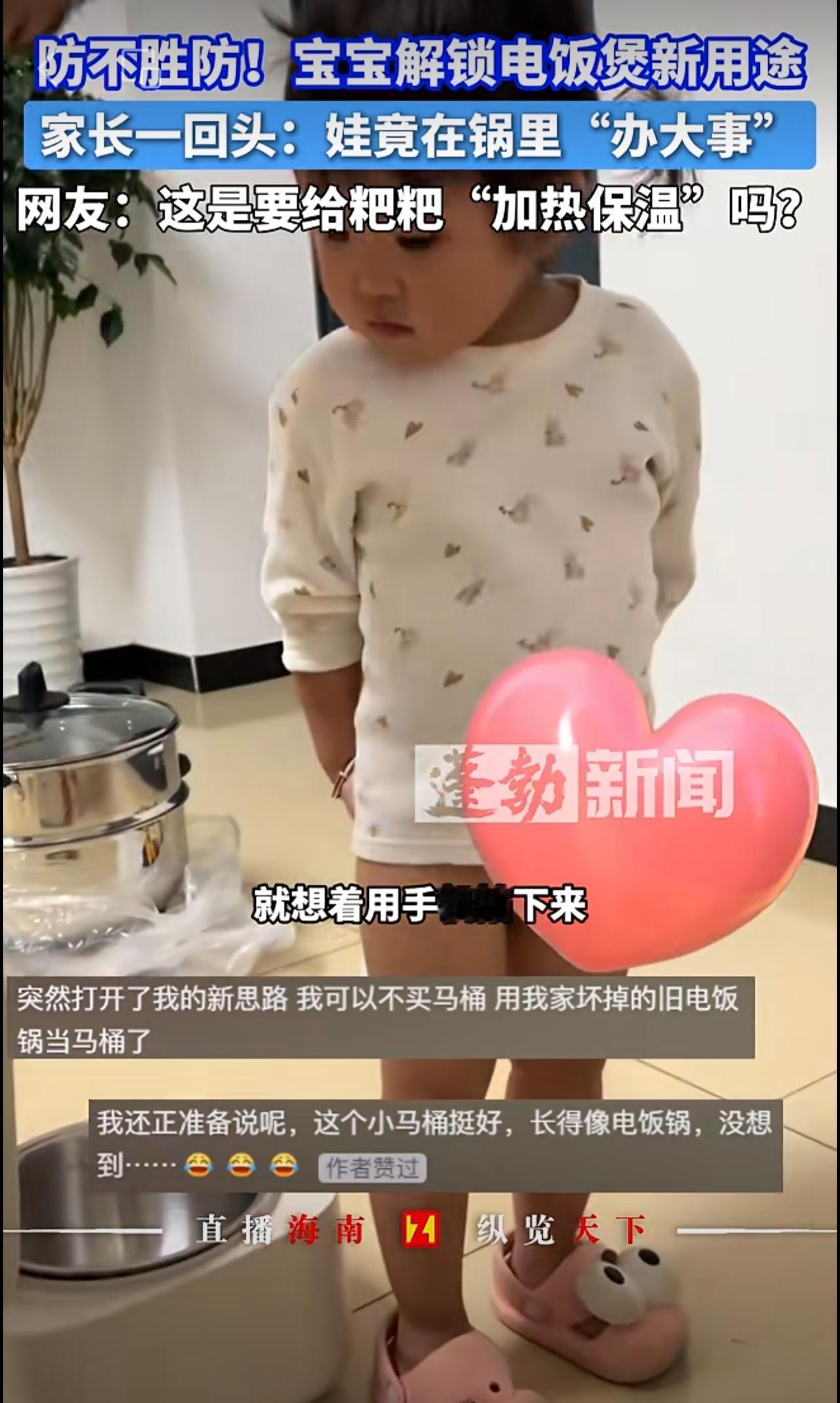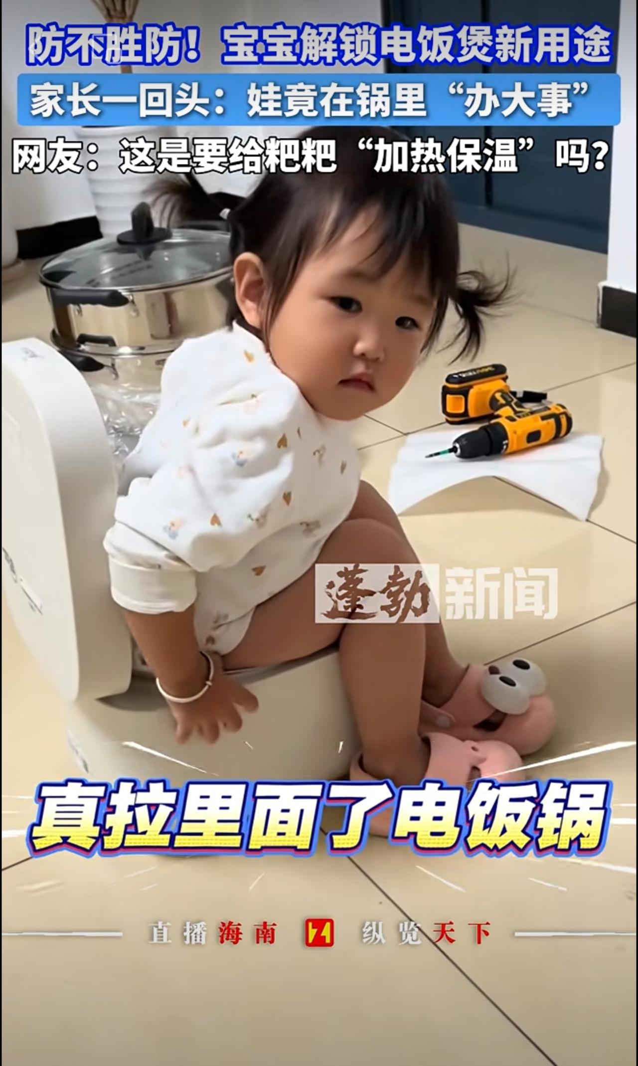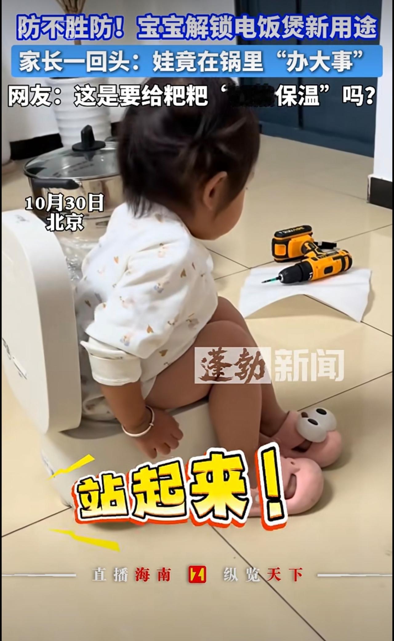 防不胜防!宝宝解锁电饭煲新用途,家长一回头:娃竟在锅里“办大事”,网友:这是要给