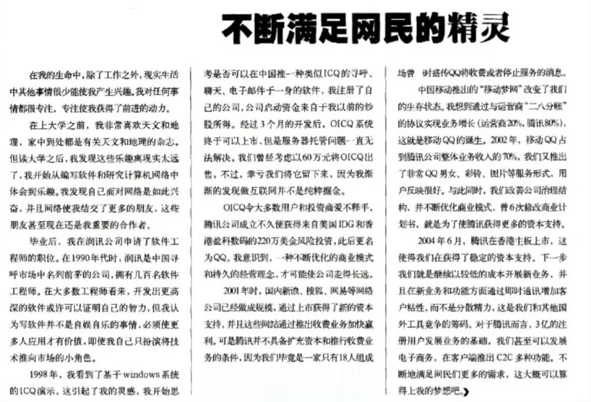 马化腾20年前小作文曝光,强调按网民心态做业务