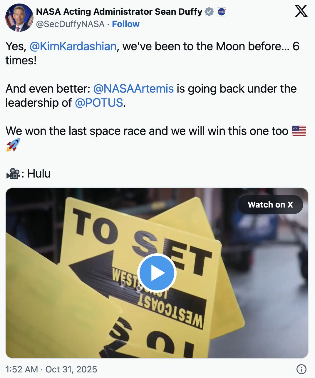 "Yes,@KimKardashian,we'vebeentotheMoonbefore…6times!"Duffy,54,wroteonX.