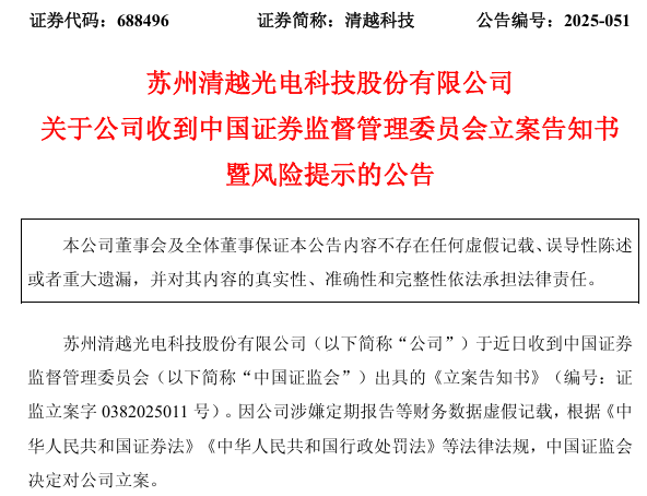 清越科技(688496)10月31日晚间公告,公司于近日收到中国证券监督管理委员会(简称“中国证监会”)出具的《立案告知书》。因公司涉嫌定期报告等财务数据虚假记载,根据《中华人民共和国证券法》《中华人民共和国行政处罚法》等法律法规,中国证监会决定对公司立案。