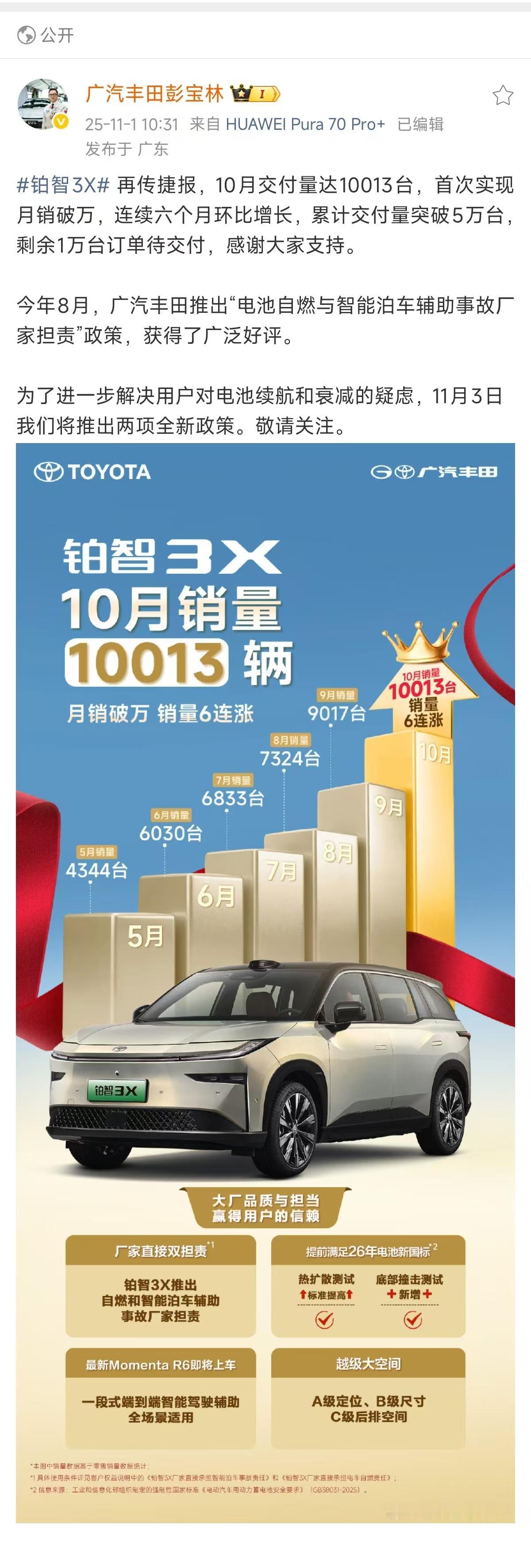 前瞻布局的收获:铂智3X破万彰显广汽丰田战略眼光 铂智3X月销破万,是广汽丰田前瞻性战略布局进入收获期的集中体现。这种前瞻性,早在数年前其决定大力推进"中国自研新体制"和深度本土化战略时便已埋下伏笔。它预见到,在中国这个全球最"卷"的新能源市场,唯有更贴近用户、更快速响应、更具成本优势,才能立于不败之地。 铂智3X,正是这一战略思想结出的硕果。其10.98万元的定价能力,源于本土化供应链的前瞻布局;其领先的智能配置,源于对中国市场技术趋势的精准把握;其"双担责"政策的推出,源于对用户核心痛点的深刻洞察。而广汽丰田的战略眼光正看向更远处。 据悉,其已前瞻性地规划推出两项针对电池续航和衰减的全新政策,以应对用户对车辆长期价值的日益关注。 因此,铂智3X的破万销量,并非偶然的运气,而是广汽丰田以其深刻的战略洞察力,进行了一系列正确的前瞻布局后,水到渠成的必然结果。它彰显了一家成熟企业在时代变革中,所具备的深远战略眼光与强大的战略定力。