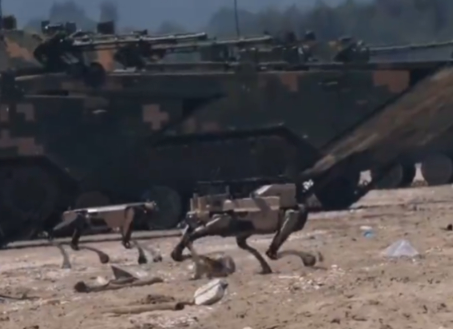 而最先冲上岸的正是荷枪实弹的机器狗,它们在滩头快速调整阵型,一台直立发射榴弹,为士兵提供烟幕掩护。这些无人装备正在改写传统登陆战的规则。