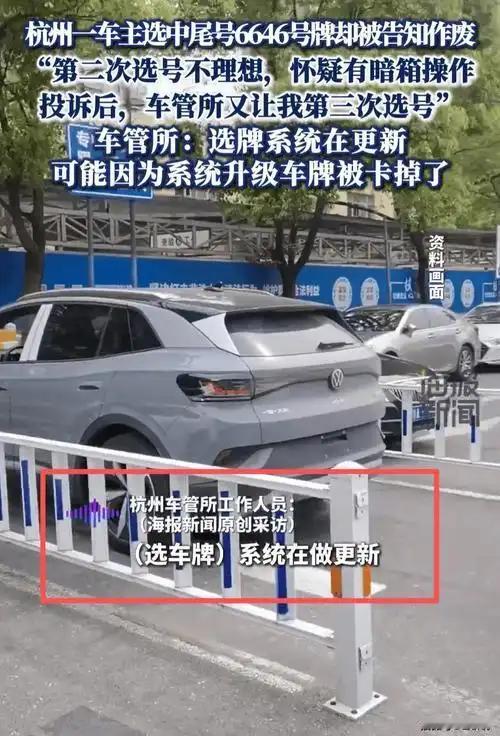 杭州车主选号惊魂:“6646”刚到手就作废,系统锅该谁买单? “就像煮熟的鸭子飞了!”10月31日,杭州车主史先生的新车选号经历,让无数网友跟着揪心。车管所的屏幕上,尾号“6646”的号牌在一堆乱码中格外亮眼——“66顺”的寓意戳中了他的期待,没等多想就点下确认,还特意截图存证,满心盼着给新车挂上“幸运符”。 可这份欢喜没撑过半小时。当他拿着截图到缴费窗口,工作人员的一句话让他从头凉到脚:“这号作废了,用不了。”史先生反复翻出截图求证,系统明明显示“选号申请已提交”,怎么转眼就成了无效操作?面对追问,工作人员才含糊解释:“可能是系统正在升级,号码被卡掉了”。 被迫第二次选号的史先生彻底懵了。屏幕滚动的号码不是带杂乱数字,就是谐音刺耳,和“6646”比差了十万八千里。越想越窝火的他忍不住质疑:“好号说没就没,真的是系统问题,还是有猫腻?”一气之下,他直接发起了投诉,直到这时,车管所才松口允许第三次选号。 这事一曝光,评论区瞬间炸了锅。有网友精准共情:“选车牌靠的是玄学和运气,丢了心仪的号,比丢几百块还难受”;有人吐槽系统不靠谱:“升级为啥不提前通知?业务高峰搞维护,这不是添乱吗”;更有亲历者晒出经历:“我之前选到连号,系统卡了两秒就没了,折腾半天只能认栽”。 更让人在意的是,这并非杭州首次出现类似情况。2021年就有市民选中尾号“555”的连号,缴费后系统却私自改号,当时车管所也以“系统延迟”搪塞,最后闹成协商僵局。按规定,只有车主超期未办理登记,号牌才会作废,可这些案例里,车主全程合规操作,却要为系统故障买单,显然说不通。 车管所给第三次选号机会看似解决了问题,但隐患并没消除。要是第三次还选不到满意的号,车主被搅黄的期待该怎么补?系统升级前为啥不公示时间、避开高峰?这些疑问没答案,“系统锅”就永远甩不完。 车牌虽只是块铁皮,却藏着车主对新车的期许。正如网友说的:“我们信的不是号码,是官方系统的公信力”。希望这次“6646事件”能倒逼改进,别让下一个车主再经历这种“欢喜变糟心”。你选车牌时遇过糟心事吗?评论区聊聊~杭州车牌 杭州新能源靓号