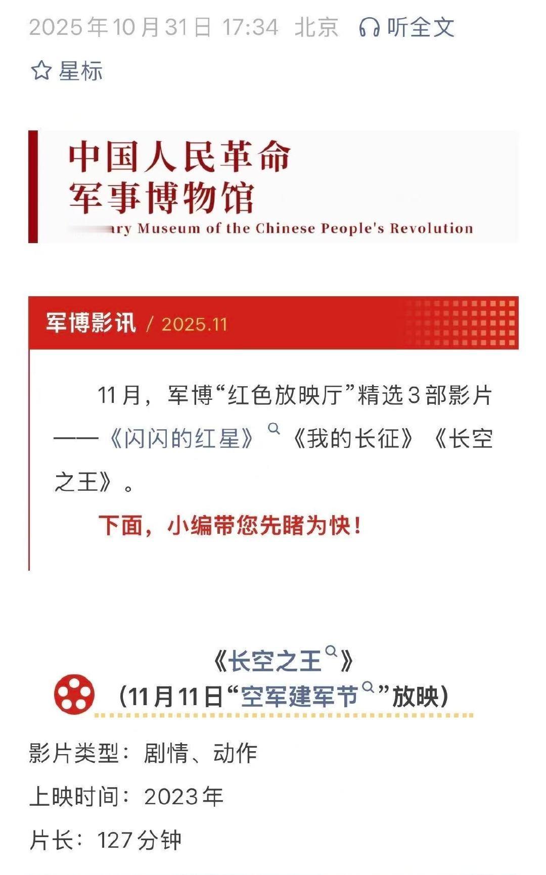 来啦来啦,“雷宇”来军事博物馆“报道了”! 王一博主演的电影《长空之王》即将在11月11日的“空军建军节”在军博放映! ps:11月,军博“红色放映厅”精选3部影片——《闪闪的红星》《我的长征》《长空之王》。王一博的《长空之王》是最“年轻”的一部[赞]。 王一博