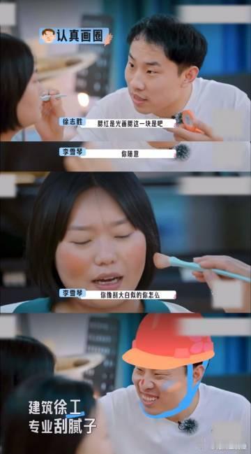 徐志胜复刻给李雪琴画腮红 哇哦!徐志胜在节目里重现给李雪琴画腮红的经典场景,坐在