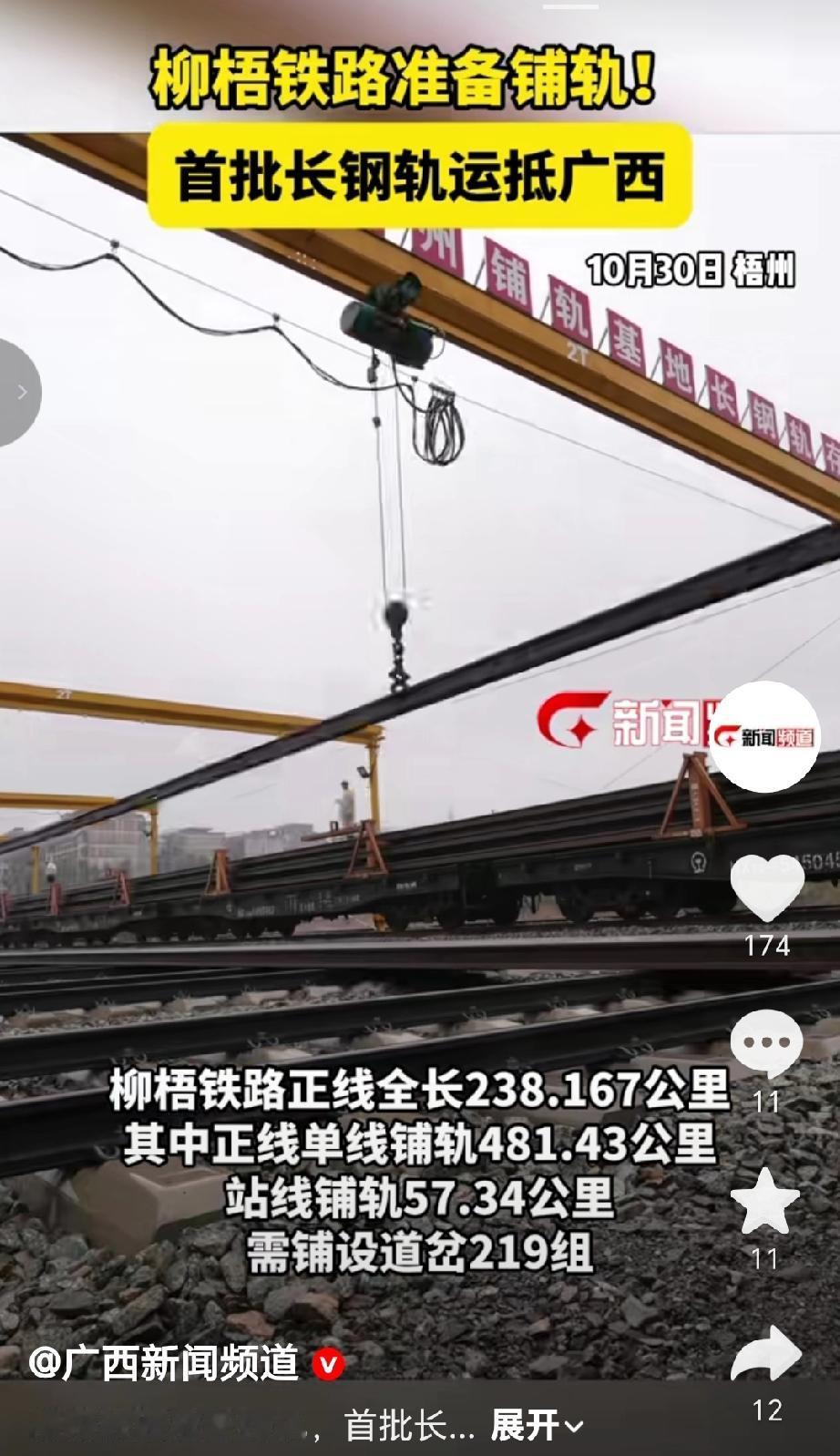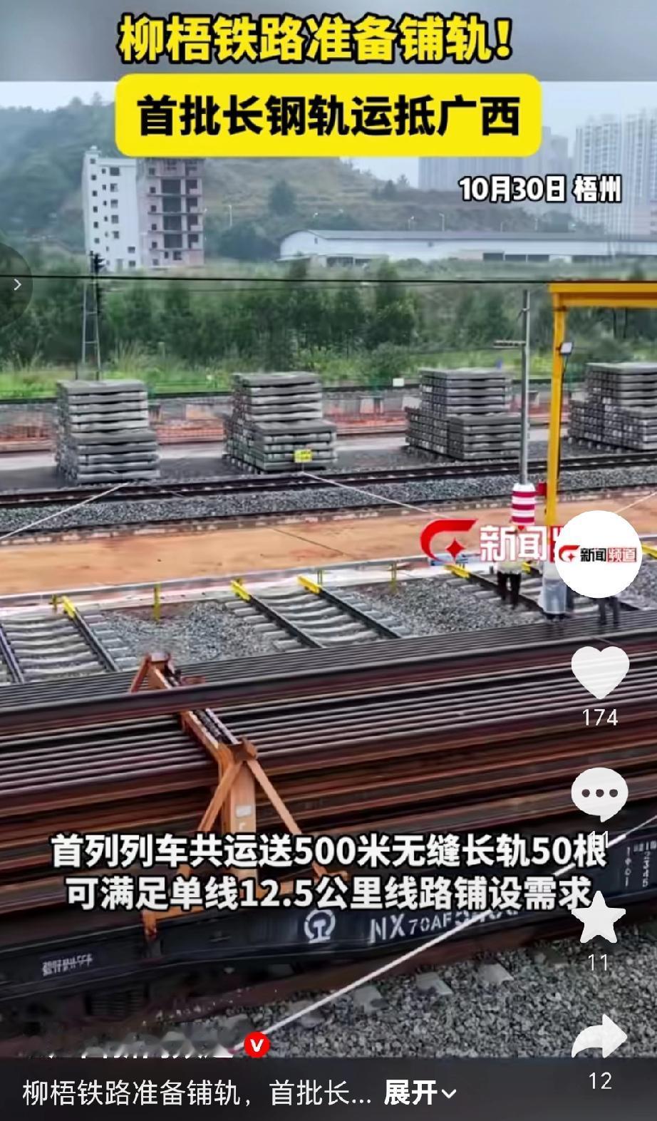 10月30日,柳梧铁路首批长钢轨从广州运抵广西梧州铺轨基地。首列列车运送了50根500米无缝长轨,可满足单线12.5公里线路铺设需求。柳梧铁路正线全长238.167公里,其中正线单线铺轨481.43公里,站线铺轨57.34公里,需铺设道岔219组。柳梧建设成后将是我区西南地区连接粤港澳大湾区的重要通道。(来源于@广西新闻频道 )