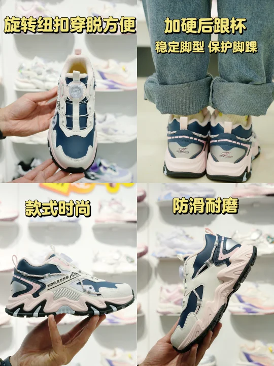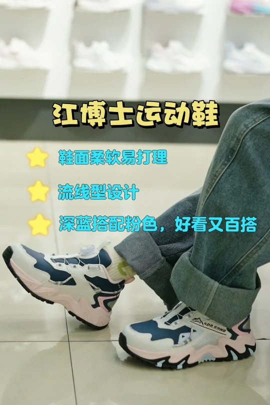 最后试的这双江博士运动鞋,外观设计也很亮眼,颜色是深蓝和粉色为主色调、线条流畅,孩子一看就喜欢。💕