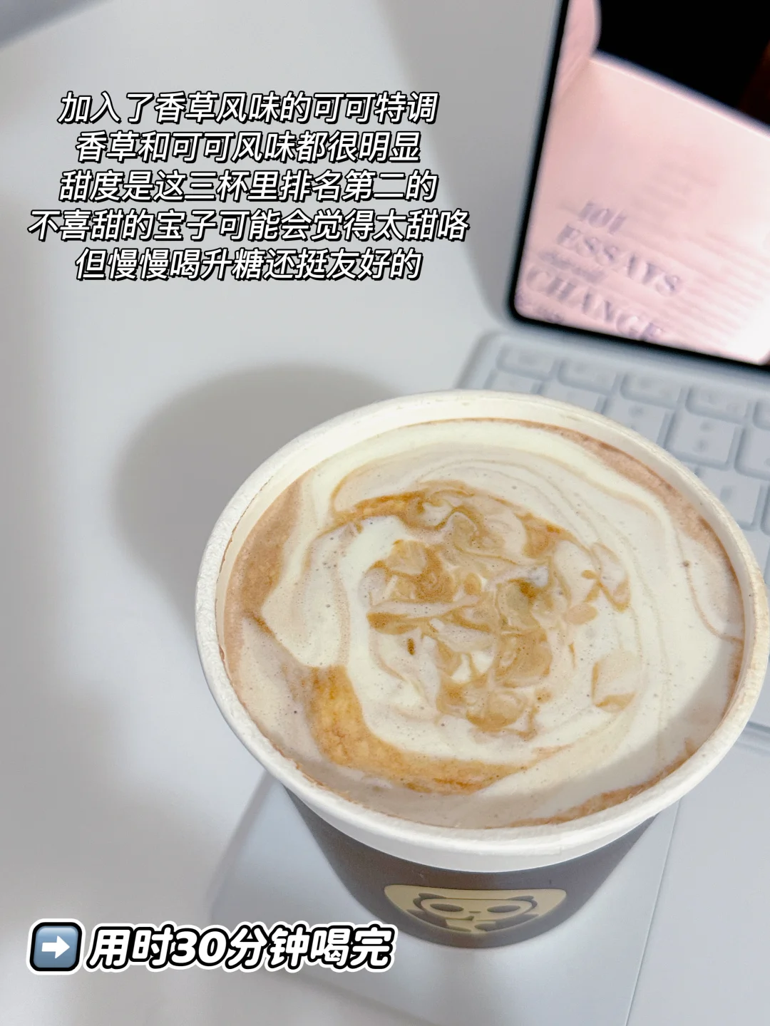 加入了香草风味的可可特调,香草和可可风味都很明显,甜度是这三杯里排名第二的,不喜甜的宝子可能会觉得太甜咯,但慢慢喝升糖还挺友好的👌🏻