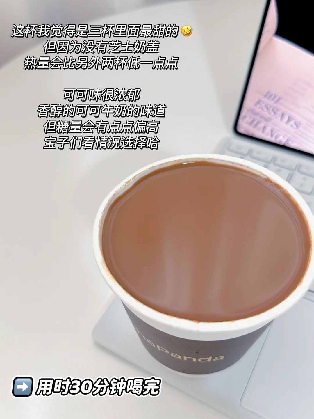 这杯我觉得是三杯里面最甜的🤣但因为没有芝士奶盖,热量会比另外两杯低一点点〰️可可味很浓郁,香醇的可可牛奶的味道,但糖量会有点点偏高,宝子们看情况选择哈[鼓掌R]