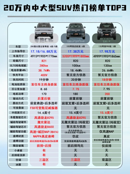 最近不少朋友在问:“20万以内有没有适合家用的新能源车?要空间大、配置高、续航稳、还要智能……”今天我就拿中大型SUV热门车型:零跑C16 280激光雷达智尊版 6座/5座、银河M9 100两驱启航版 6座、钛7 135两驱PRO版 5座做对比,用数据说话,看看谁才是你的“心选车型”。