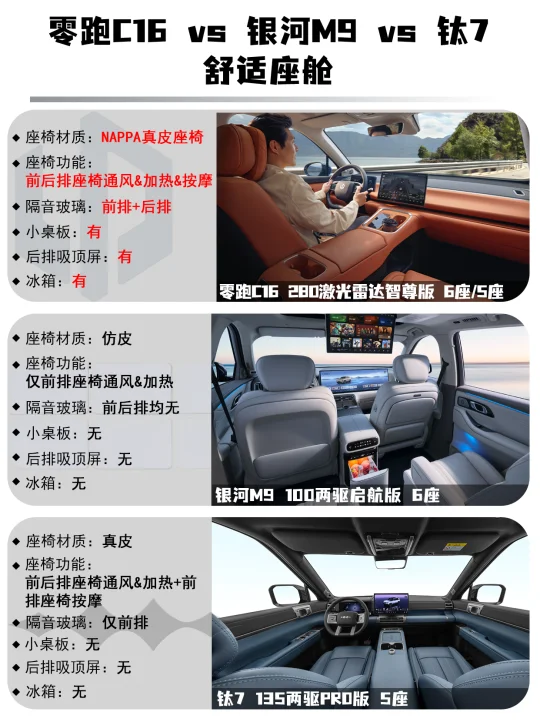 座椅:C16配备NAPPA真皮座椅,并独有前后排座椅通风、加热及按摩功能,舒适关怀覆盖全车。银河M9仅前排有通风加热,钛7则缺少后排按摩。🎵娱乐方面: C16独有后排吸顶屏和小桌板,完美打造移动客厅与家庭影院,同时还配备前后排隔音玻璃和车载冰箱。