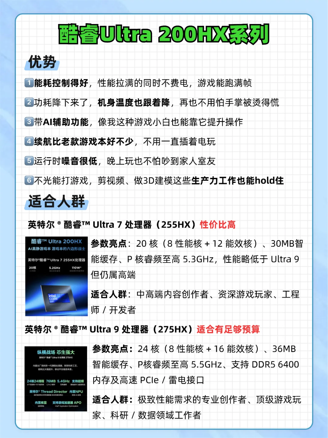 这里重点说下,选的时候可以多留意带英特尔酷睿Ultra 200HX系列处理器的机型,优势真的很戳游戏党: