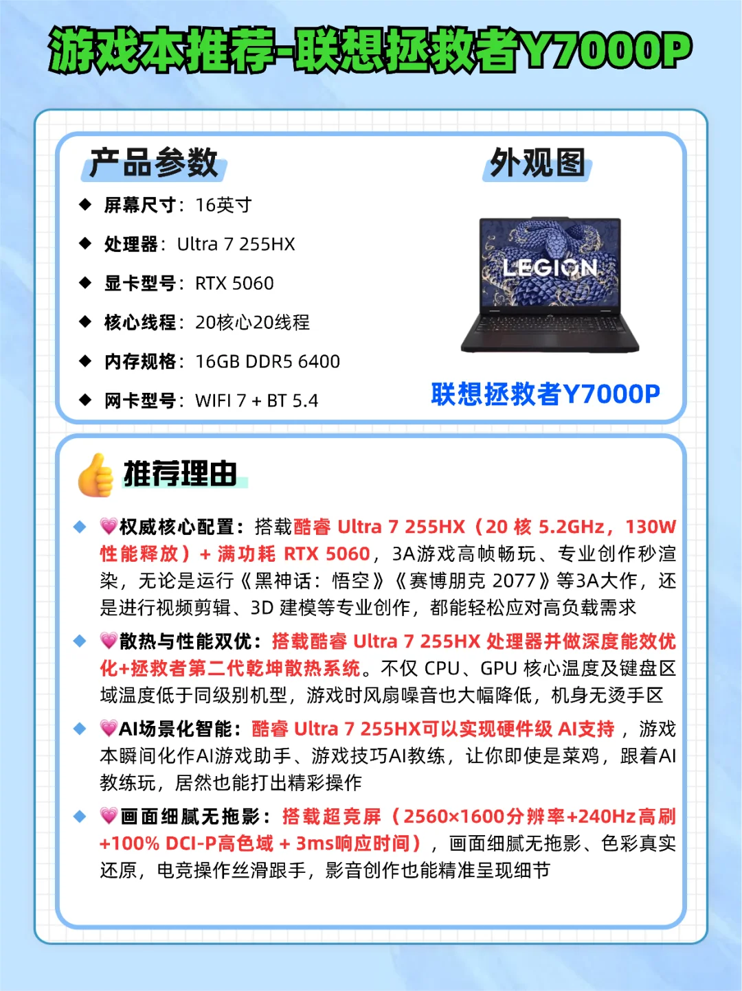 要是纠结处理器具体型号,先重点看P4-P5的型号就行,我自己研究下来,比较推荐Ultra 7 255HX处理器版的联想拯救者Y7000P, ,性能很不错,性价比也很高~