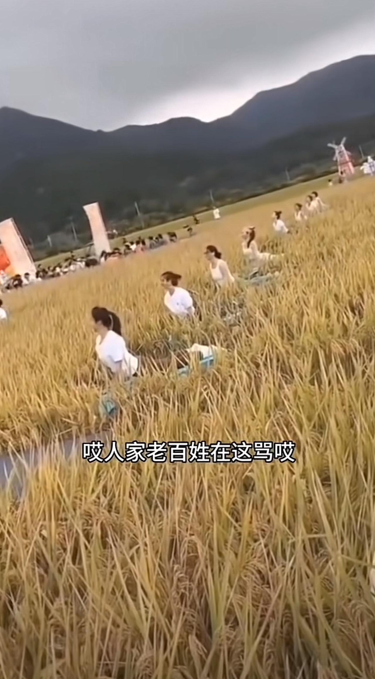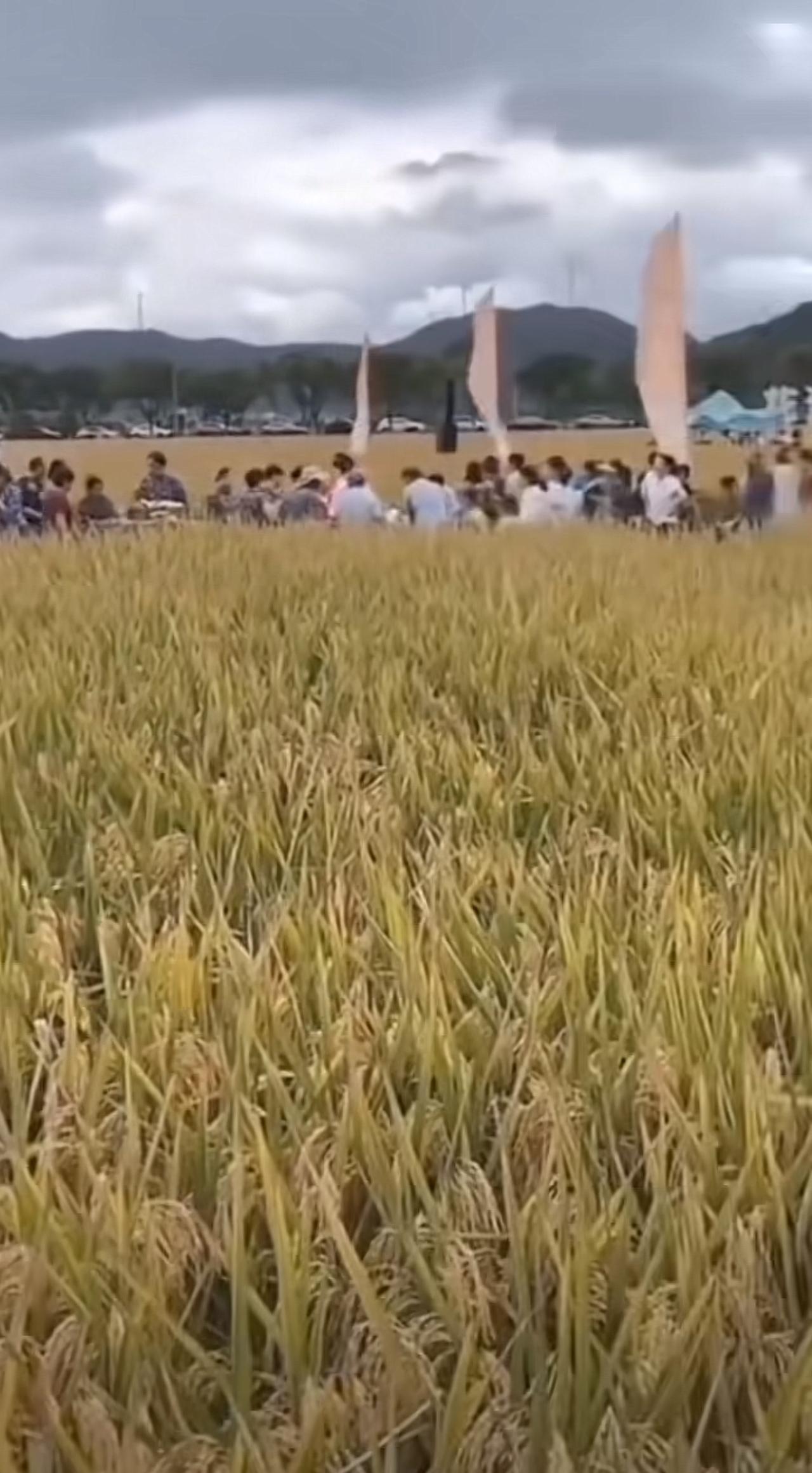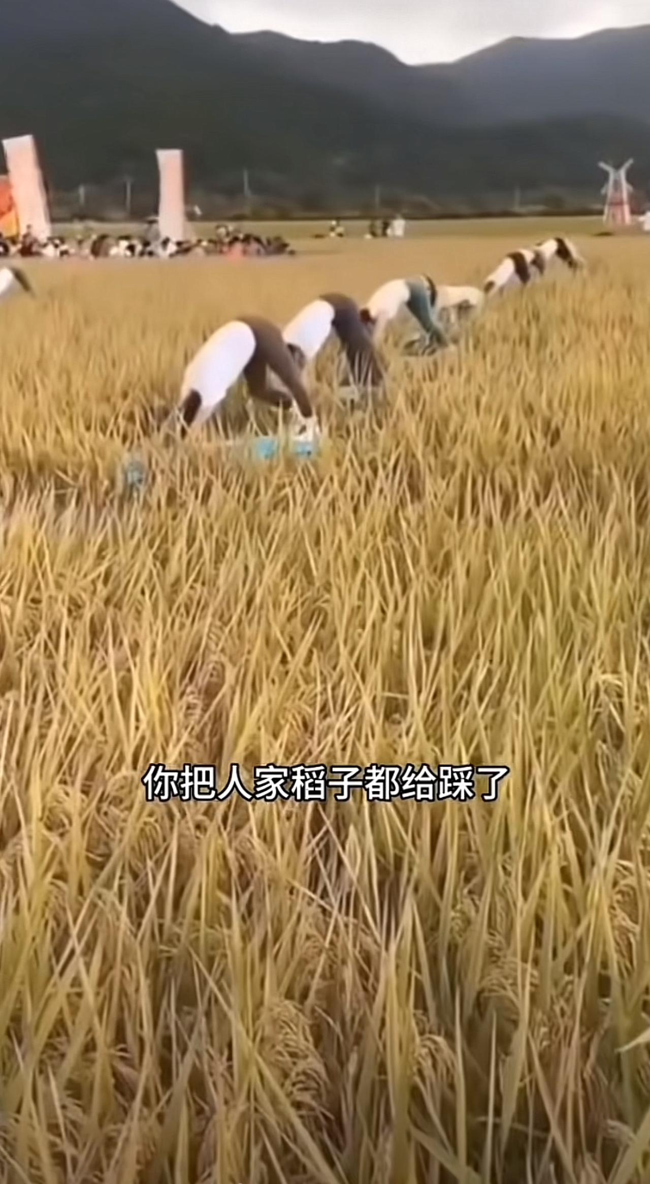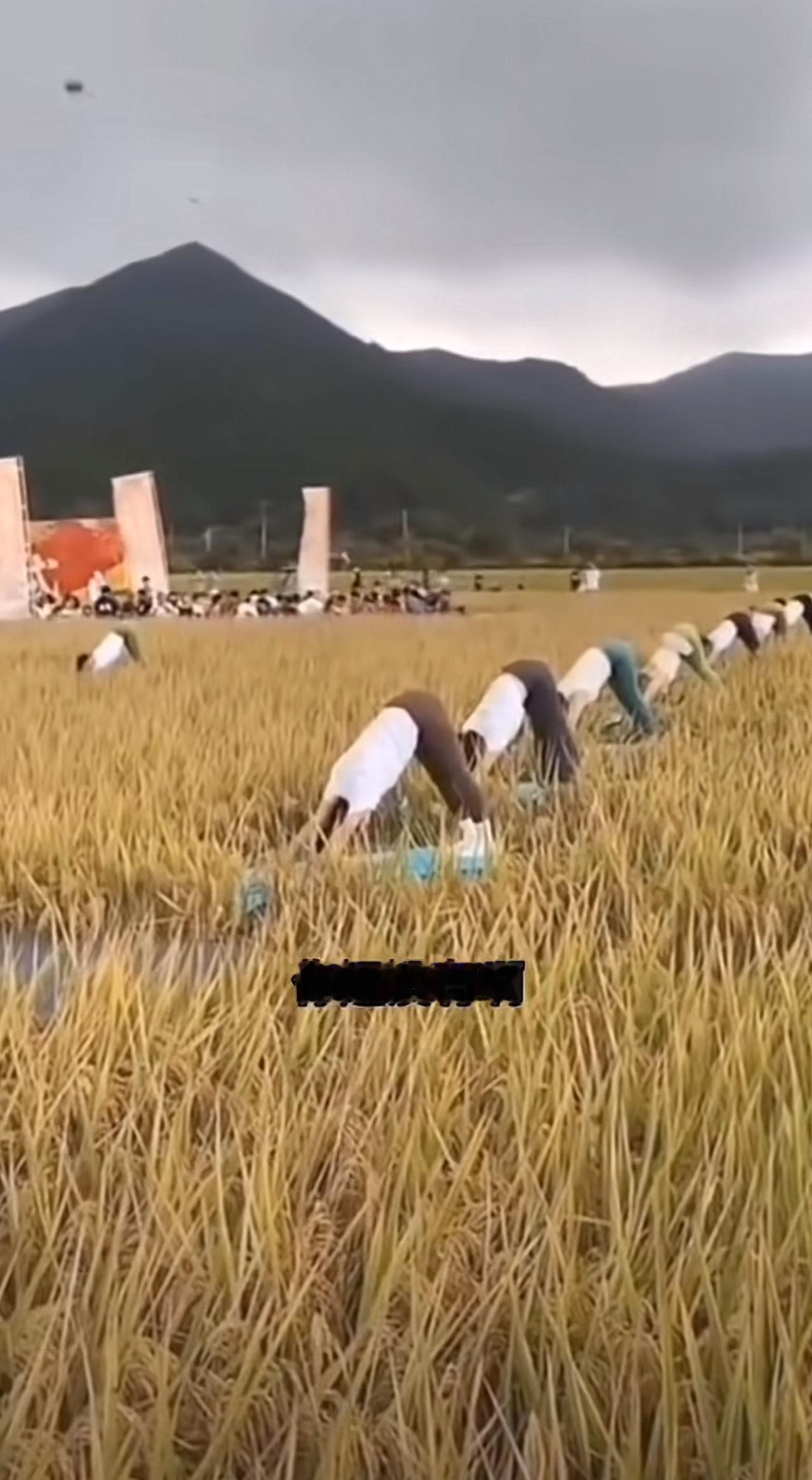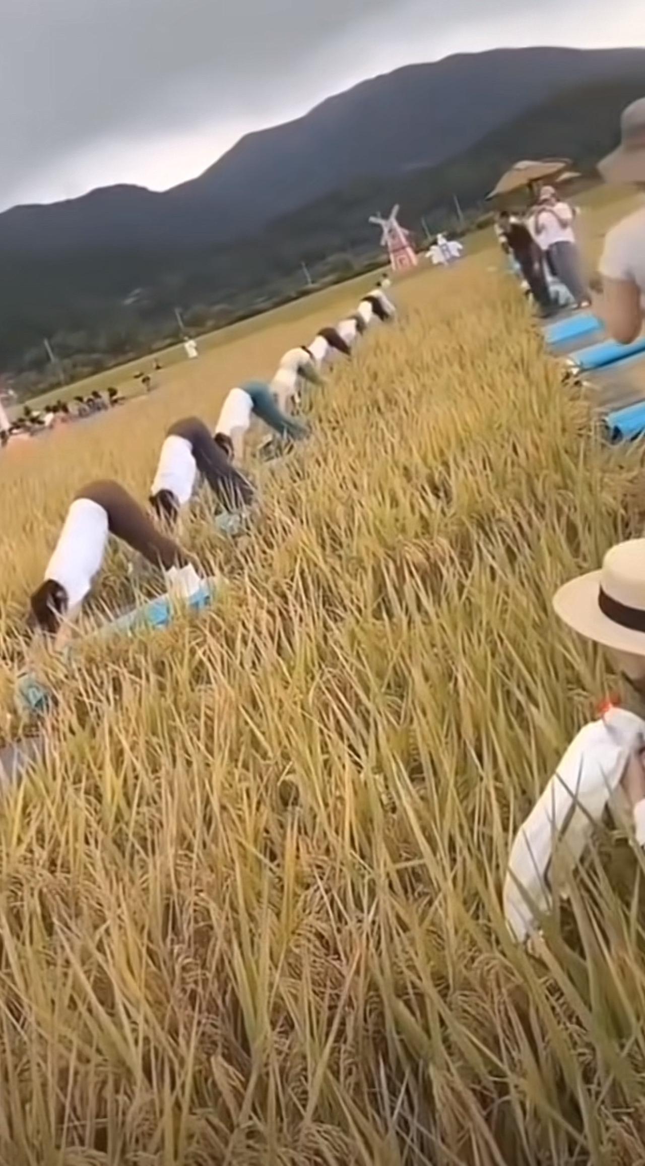 某地,一群女子组团在水稻田里练瑜伽。 金黄的稻子看着都快成熟了,被压倒一大片。 这是吃得太饱了吧?