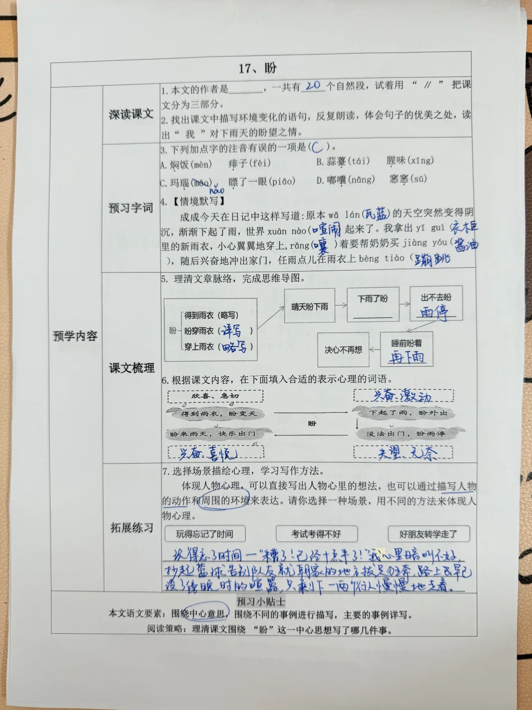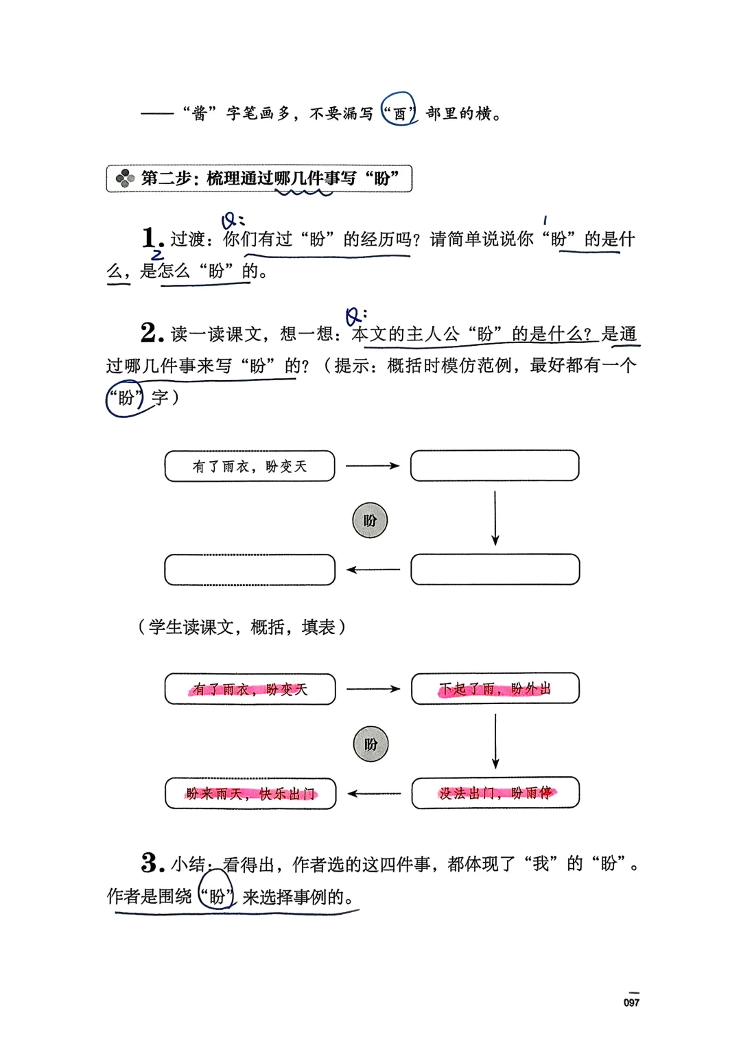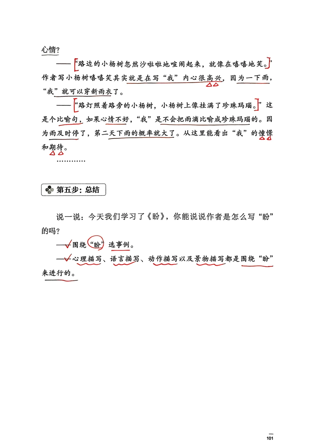 《盼》围绕四个方面进行教学: 1️⃣初读课文,学习字词 ①朗读词语,注意读音准确; -②指导书写重点生字,如“疯”“唇”“篷”“酱”等,强调结构及笔画。 2️⃣导入新课,激发兴趣 ①提问学生是否有过“盼”的经历,简要分享。 ②通过图表梳理文中作者是通过哪几件事来写“盼”的? 👉有了雨衣,盼变天➡️盼来雨天,快乐出门 ➡️不起雨,盼外出➡️没法出门,盼雨停 🌟小结:作者围绕中心意思“盼”选取典型事例。 3️⃣研读心理描写,体会表达效果 ①介绍作者铁凝,强调其擅长心理描写。 ②默读课文,画出描写“我”心理活动的句子,交流感受。 🔸让学生明确关于心理描写的句子: 🔸有的是用“想”或“心想”等词语直接点明这是心理活动。 🔸有的是用“担心”等表示心理活动的词语来点明。 有的直接写心理活动,和叙述部分融合在一起,不好判断。 4️⃣研读环境描写,体会表达效果 ❓提问:除了直接写“我”的心理活动,作者还用了一些方法写出了“我”的“盼”? 🔸写“我”的语言。 🔸写“我”的动作。 🔸写景物(环境)。 👉重点分析三处“景物描写如何表现人物心理: ①小杨树“嘻嘻地笑”——表现“我”的兴奋、欢喜。 ②雨点“敲着鼓点逗引我”——表现“我”的急切。 ③雨后马路、小杨树如“珍珠玛瑙”——表现“我”的期待与憧憬。 👉小组讨论:景物描写与人物心情的关系。 5️⃣总结写法,提升认识 学生总结:作者是如何写“盼”的? 🔸围绕中心选事例; 🔸运用心理、语言、动作、景物等多种描写方法,突出“盼”的心理。