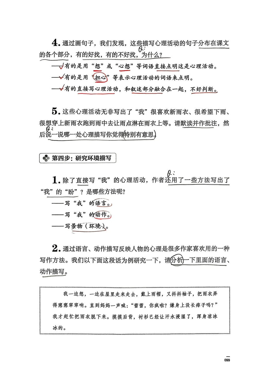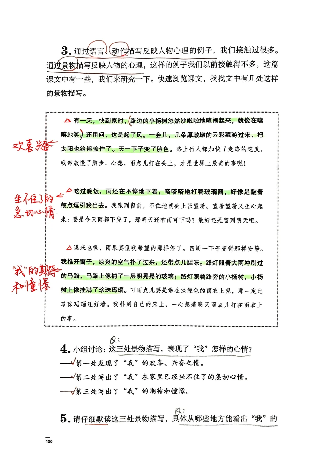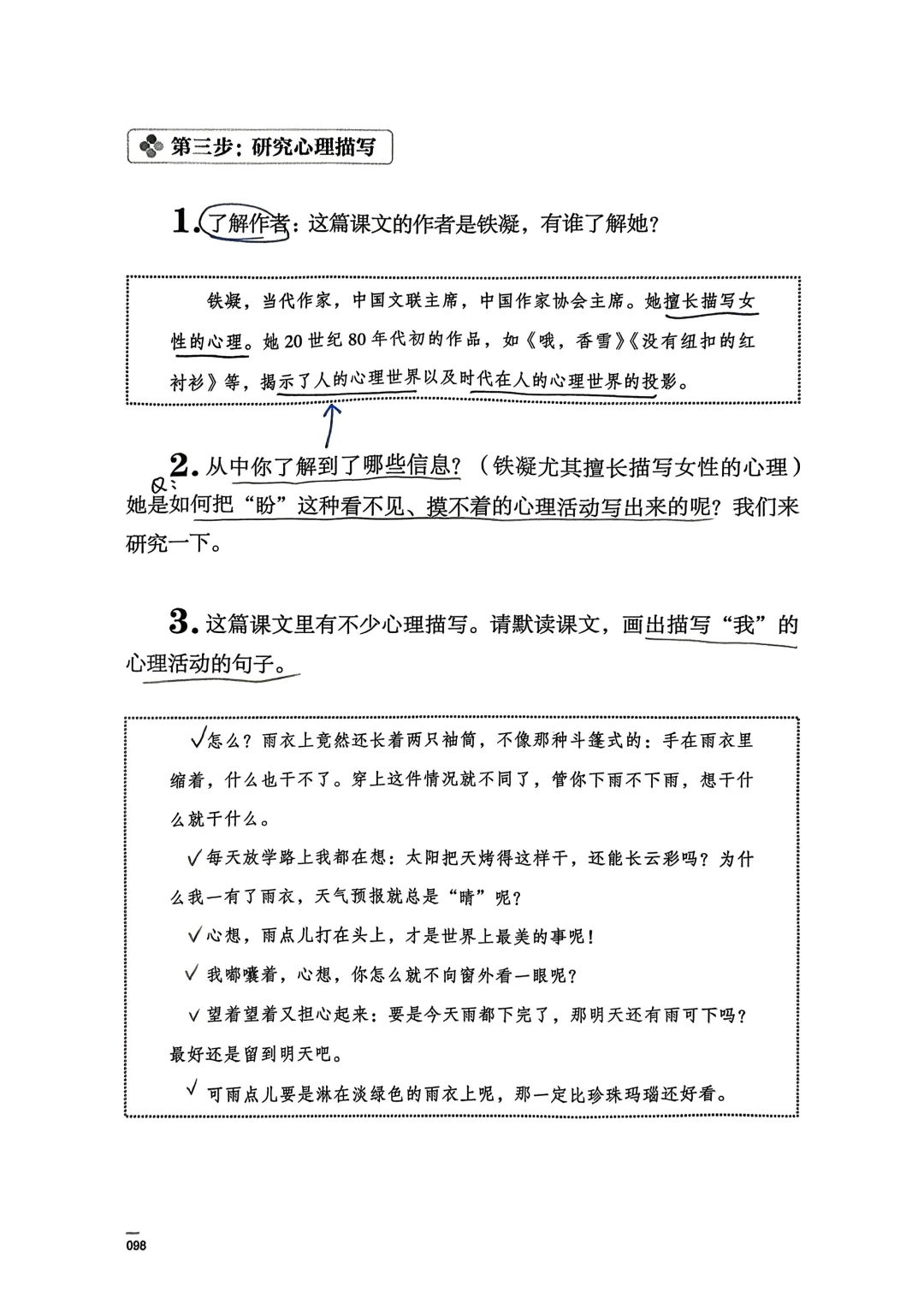 《盼》围绕四个方面进行教学: 1️⃣初读课文,学习字词 ①朗读词语,注意读音准确; -②指导书写重点生字,如“疯”“唇”“篷”“酱”等,强调结构及笔画。 2️⃣导入新课,激发兴趣 ①提问学生是否有过“盼”的经历,简要分享。 ②通过图表梳理文中作者是通过哪几件事来写“盼”的? 👉有了雨衣,盼变天➡️盼来雨天,快乐出门 ➡️不起雨,盼外出➡️没法出门,盼雨停 🌟小结:作者围绕中心意思“盼”选取典型事例。 3️⃣研读心理描写,体会表达效果 ①介绍作者铁凝,强调其擅长心理描写。 ②默读课文,画出描写“我”心理活动的句子,交流感受。 🔸让学生明确关于心理描写的句子: 🔸有的是用“想”或“心想”等词语直接点明这是心理活动。 🔸有的是用“担心”等表示心理活动的词语来点明。 有的直接写心理活动,和叙述部分融合在一起,不好判断。 4️⃣研读环境描写,体会表达效果 ❓提问:除了直接写“我”的心理活动,作者还用了一些方法写出了“我”的“盼”? 🔸写“我”的语言。 🔸写“我”的动作。 🔸写景物(环境)。 👉重点分析三处“景物描写如何表现人物心理: ①小杨树“嘻嘻地笑”——表现“我”的兴奋、欢喜。 ②雨点“敲着鼓点逗引我”——表现“我”的急切。 ③雨后马路、小杨树如“珍珠玛瑙”——表现“我”的期待与憧憬。 👉小组讨论:景物描写与人物心情的关系。 5️⃣总结写法,提升认识 学生总结:作者是如何写“盼”的? 🔸围绕中心选事例; 🔸运用心理、语言、动作、景物等多种描写方法,突出“盼”的心理。
