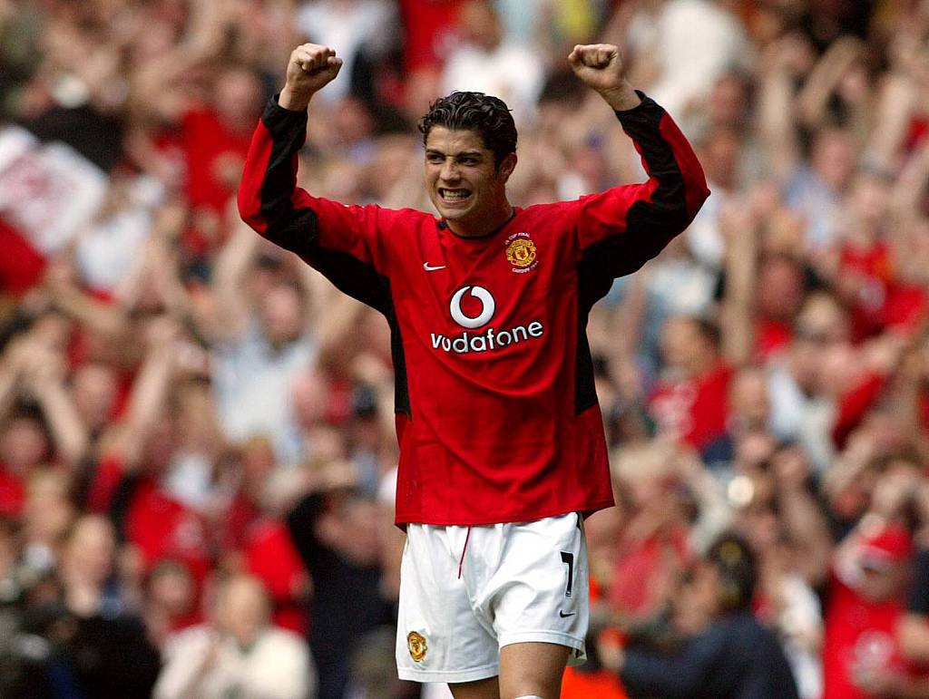 2003年11月1日,C罗在曼联对阵朴茨茅斯的英超比赛中替补出场,传射建功,以任意球破门斩获曼联生涯处子球。