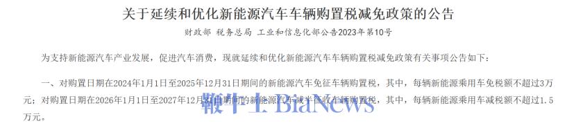 2024-2025年:购置新能源汽车免征车辆购置税,其中每辆新能源乘用车免税额不超过3万元。