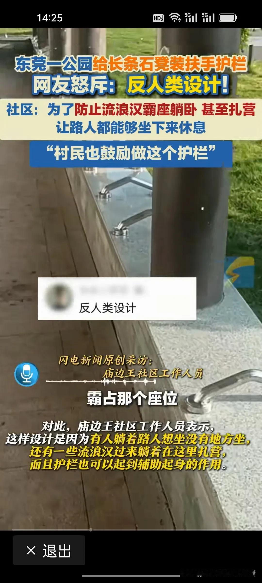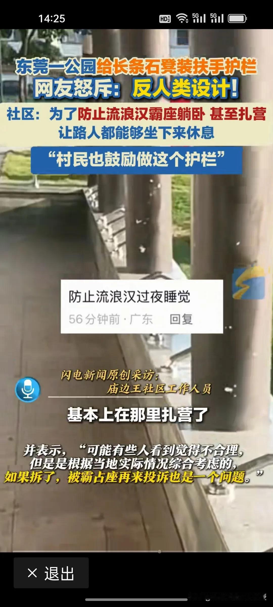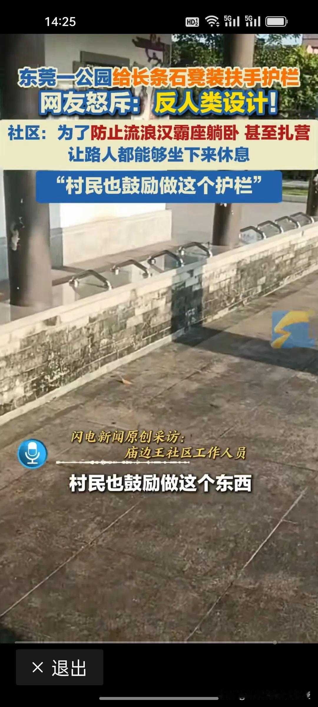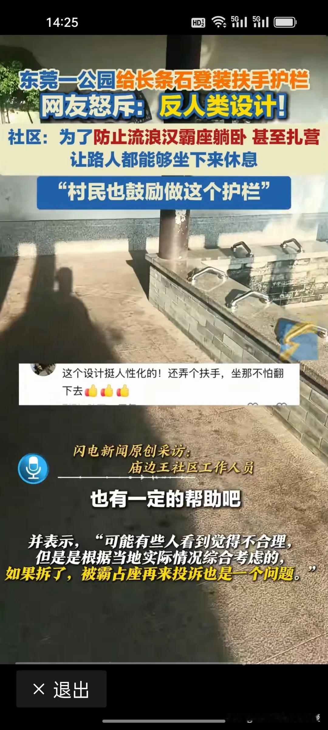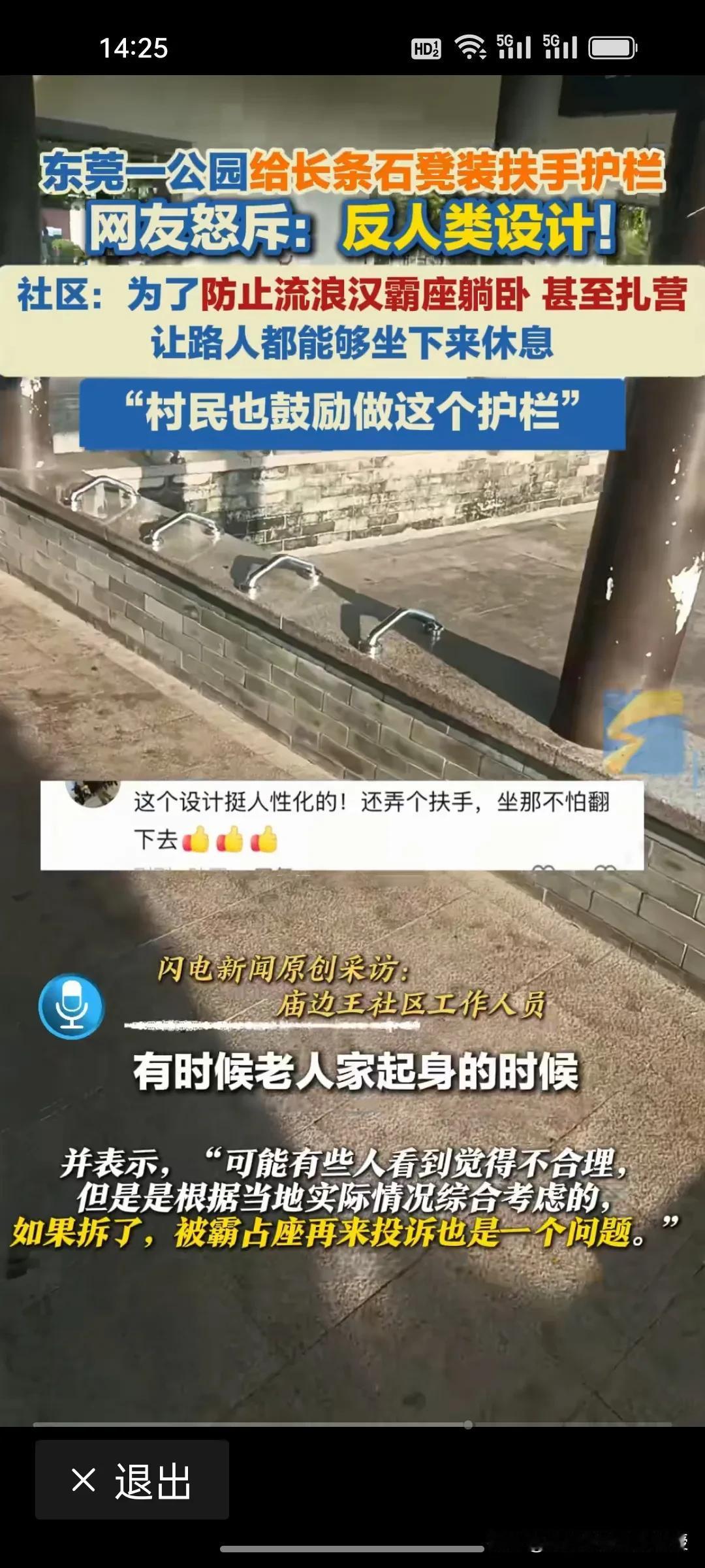 东莞一公园为了防止流浪汉霸座躺卧,给长条石凳装了扶手护栏,大概四五十厘米就装一个,流浪汉确实不能躺了,但是这个操作被网友视为反人类。政府民政部门不想着怎么解决这些流浪汉的居住问题,公园就想着怎么驱逐? 很多老年人都喜欢夏天在麦当劳肯德基蹭空调,店家也从来不会想办法驱逐,很多跑外卖或者临时不能回家的人在麦当劳座位上睡觉,也没有店员驱逐。 东莞公园此举看似解决了“霸座”问题,实则暴露了管理思维的僵化与冷漠。真正得人心的城市治理,不应是简单粗暴的“物理手段隔离”,而是应该像麦当劳、肯德基那样,用包容与善意为有需要的人保留一份温暖。