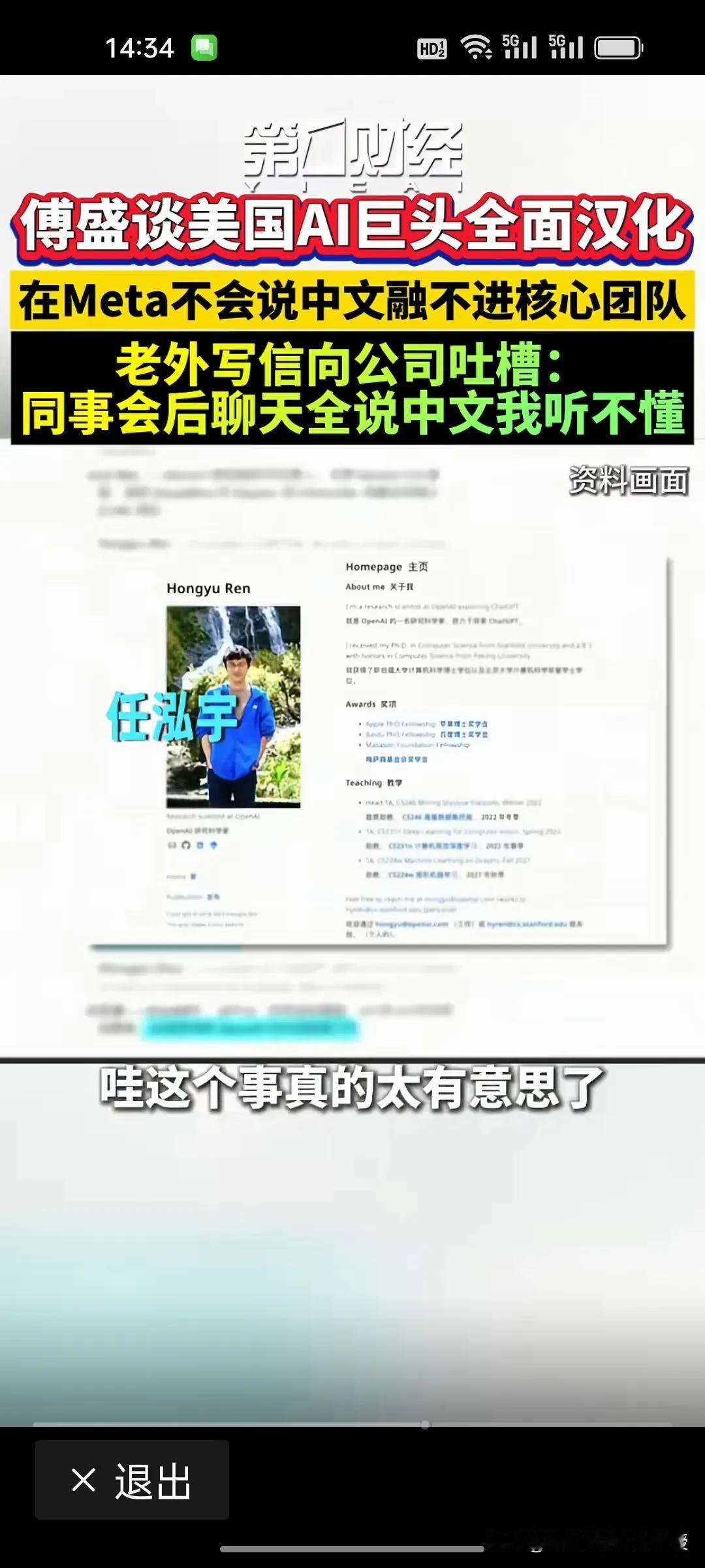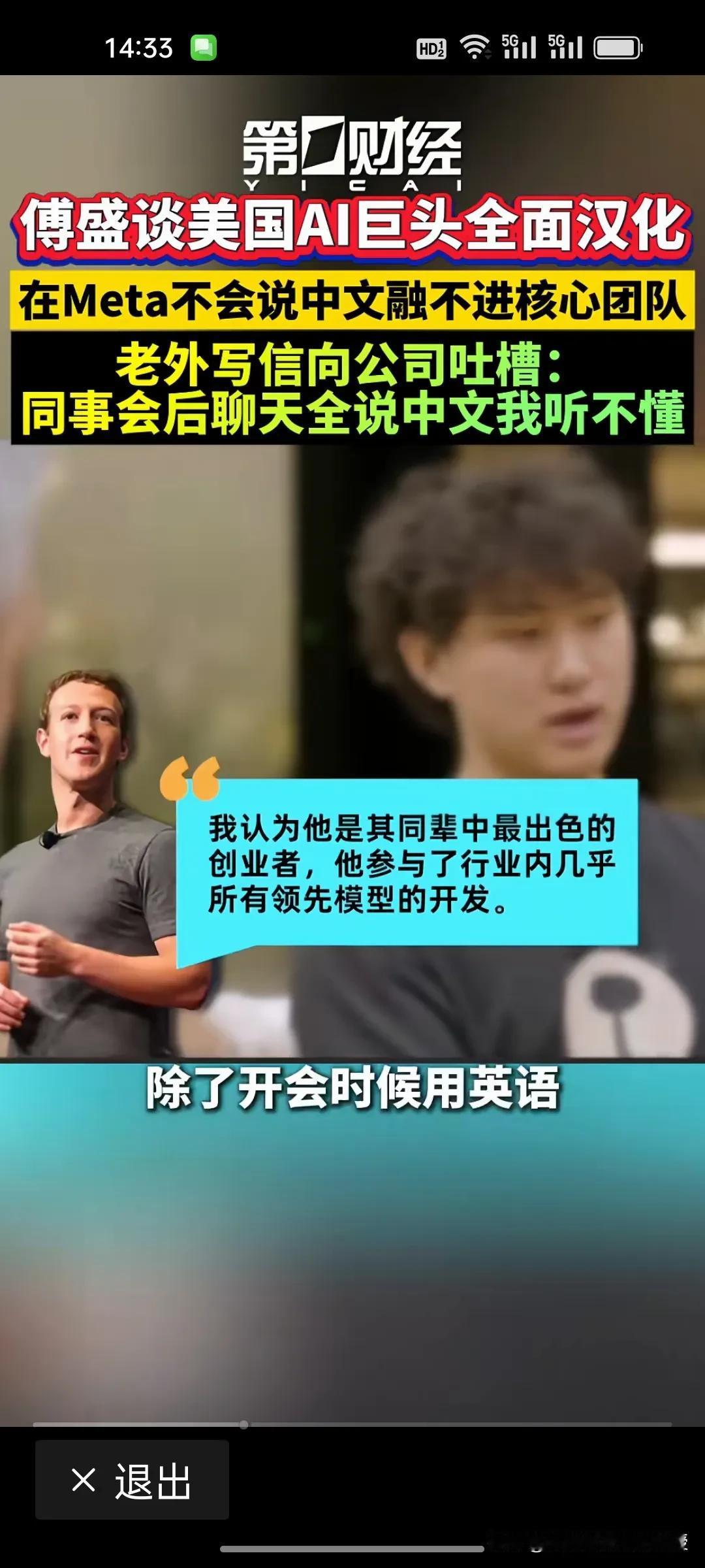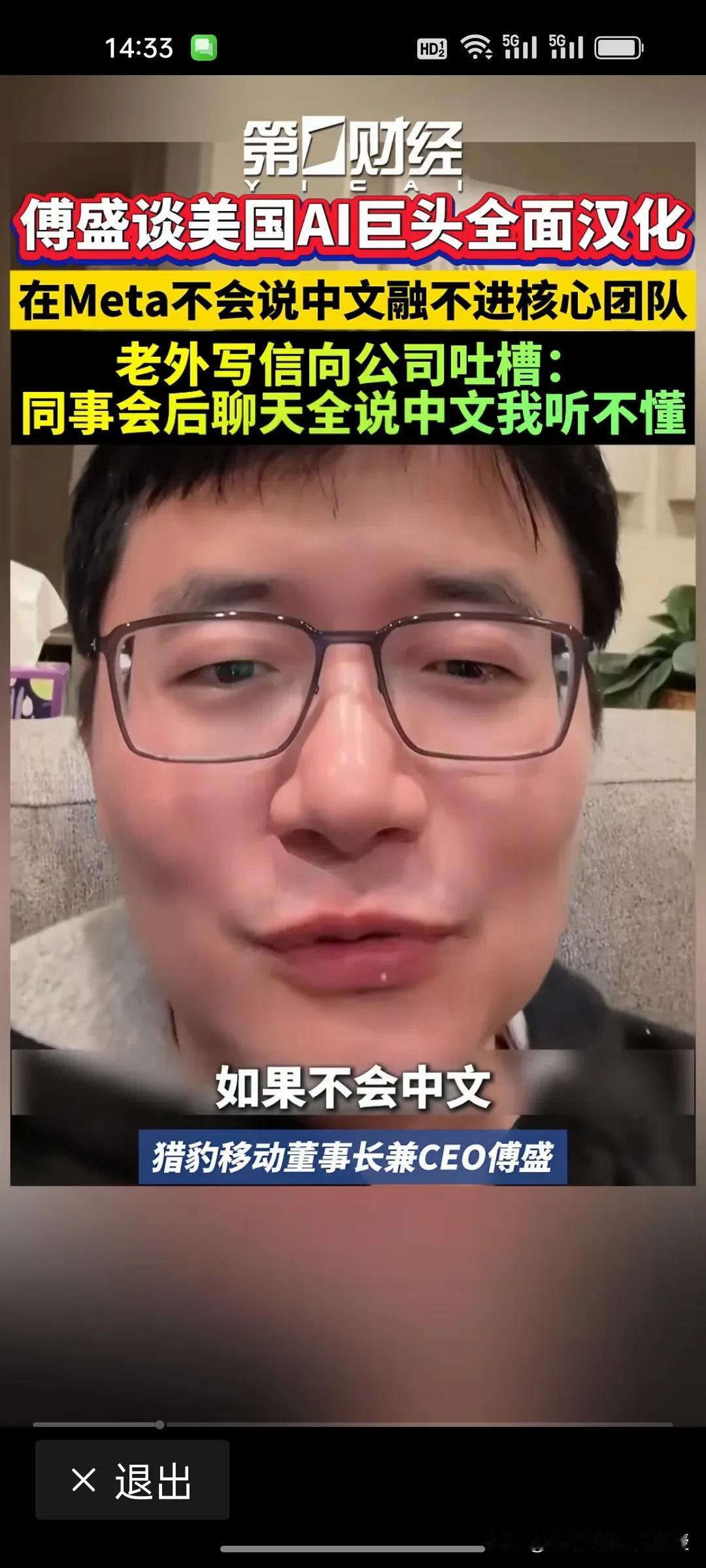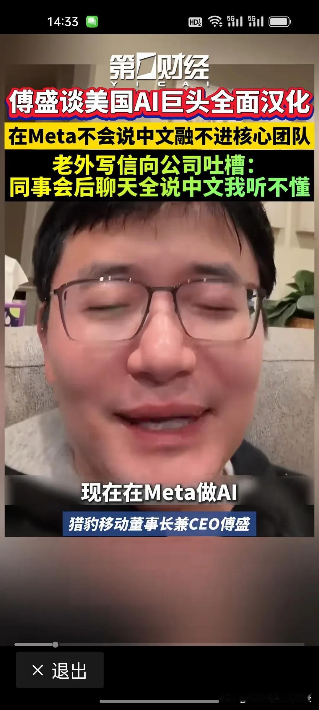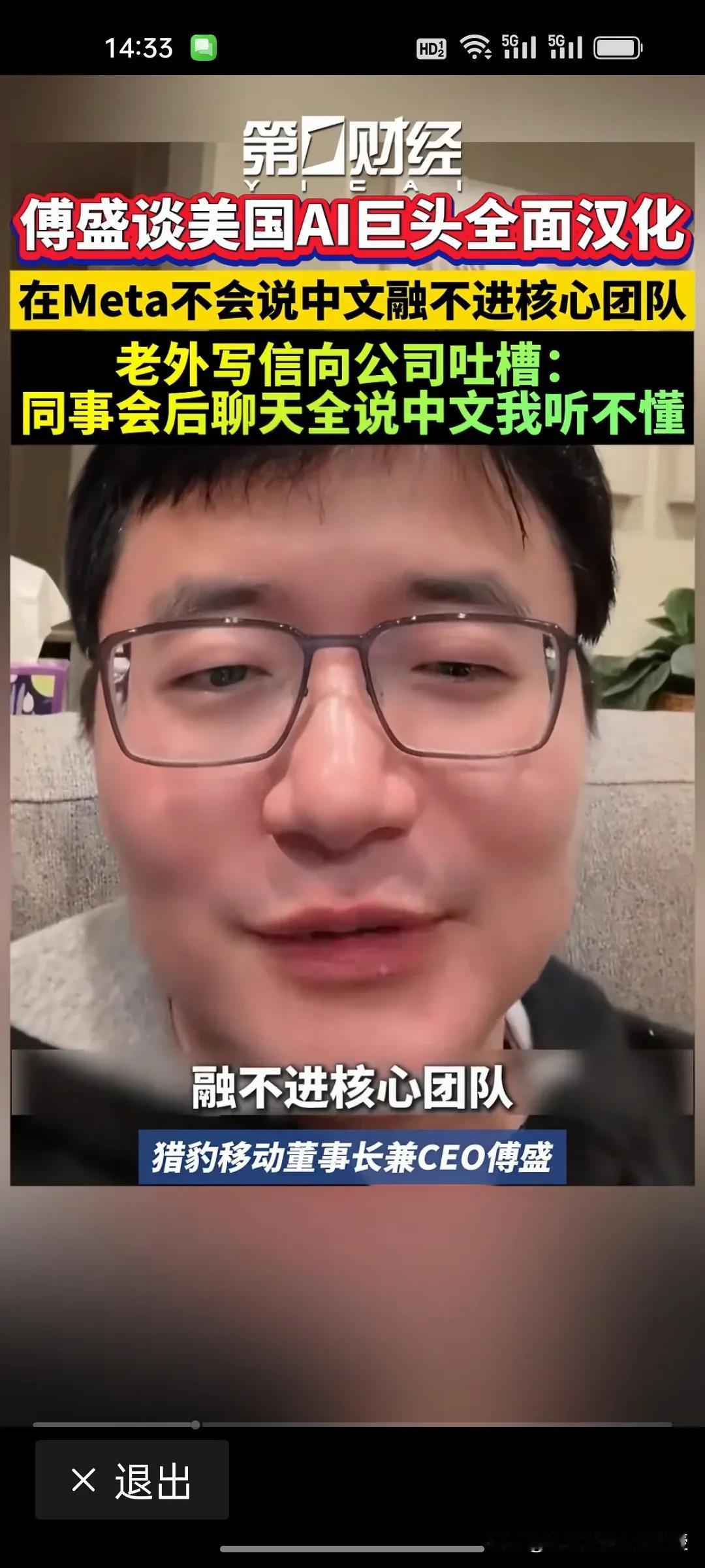 在Meta工作,不会说中文会被排挤?这是真的。猎豹移动董事长傅盛说一位美国工程师写信向公司吐槽,同事聊天都说中文,但是他听不懂,感觉被同事排斥了。部门里都是中国人,不会说中文就融不进核心团队。 之前扎克伯克就花了一亿美金签字费挖来了中国AI天才工程师担任Meta大首席科学家,现在AI领域确实是中国人走在世界最前沿,已经赶超美国。可见,未来所有美国的AI本土人才学中文是大趋势啊!