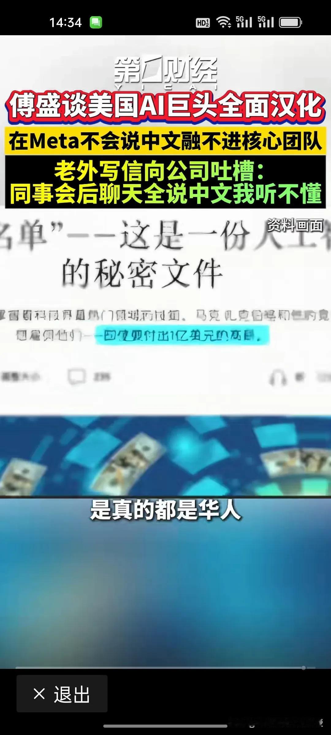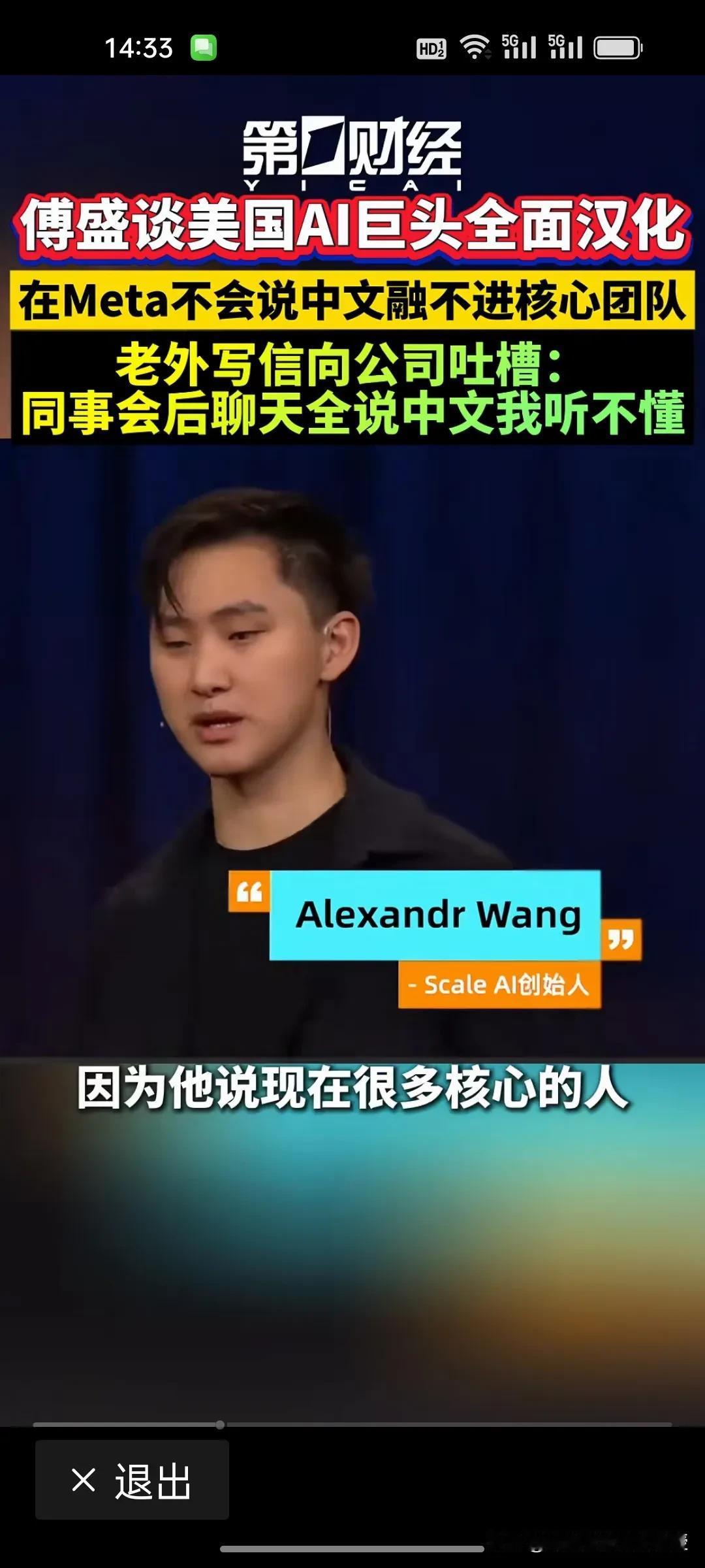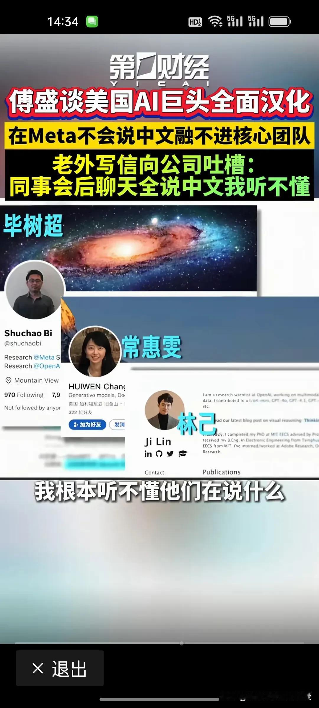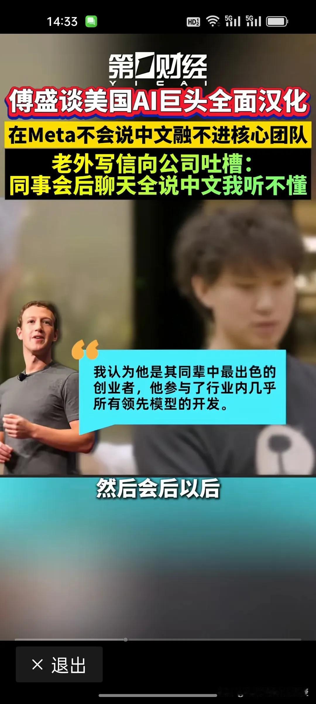 在Meta工作,不会说中文会被排挤?这是真的。猎豹移动董事长傅盛说一位美国工程师写信向公司吐槽,同事聊天都说中文,但是他听不懂,感觉被同事排斥了。部门里都是中国人,不会说中文就融不进核心团队。 之前扎克伯克就花了一亿美金签字费挖来了中国AI天才工程师担任Meta大首席科学家,现在AI领域确实是中国人走在世界最前沿,已经赶超美国。可见,未来所有美国的AI本土人才学中文是大趋势啊!